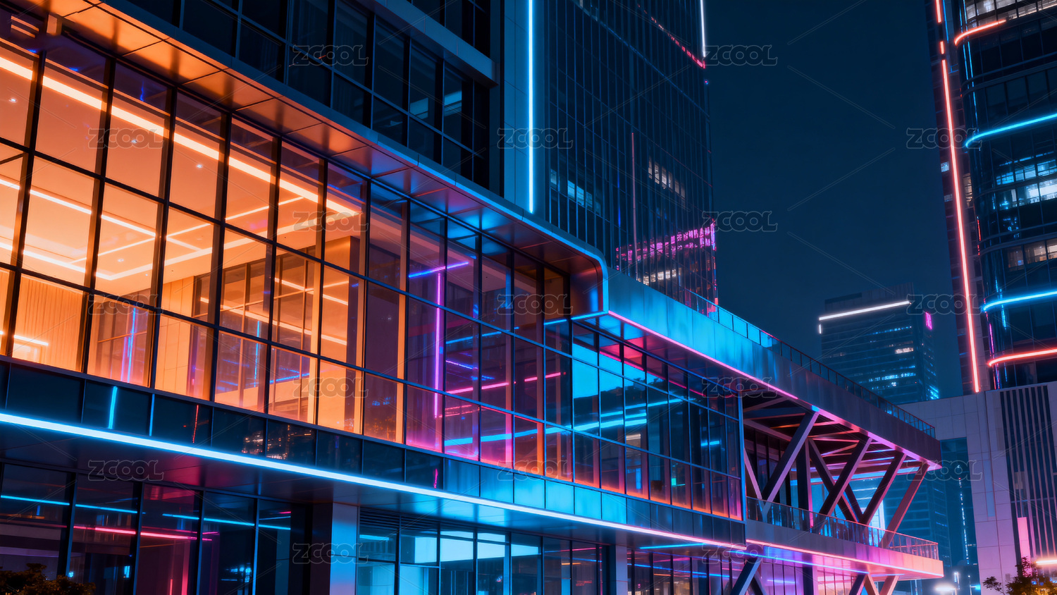 蓝色,发光,对比,现代,结构,高楼,建筑,灯光,玻璃,仰视