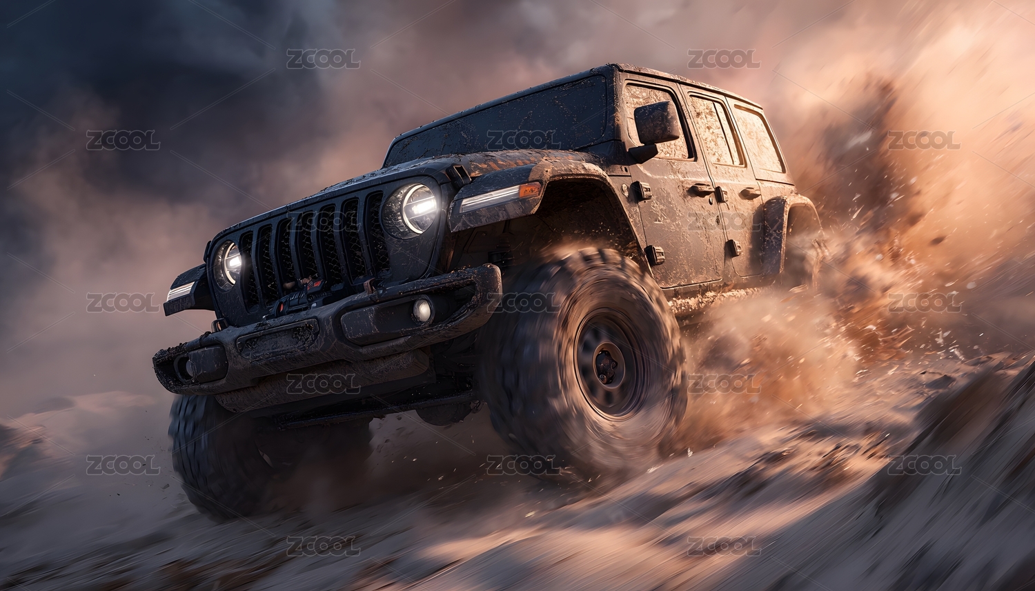 黑色吉普车沙尘飞扬越野瞬间狂野