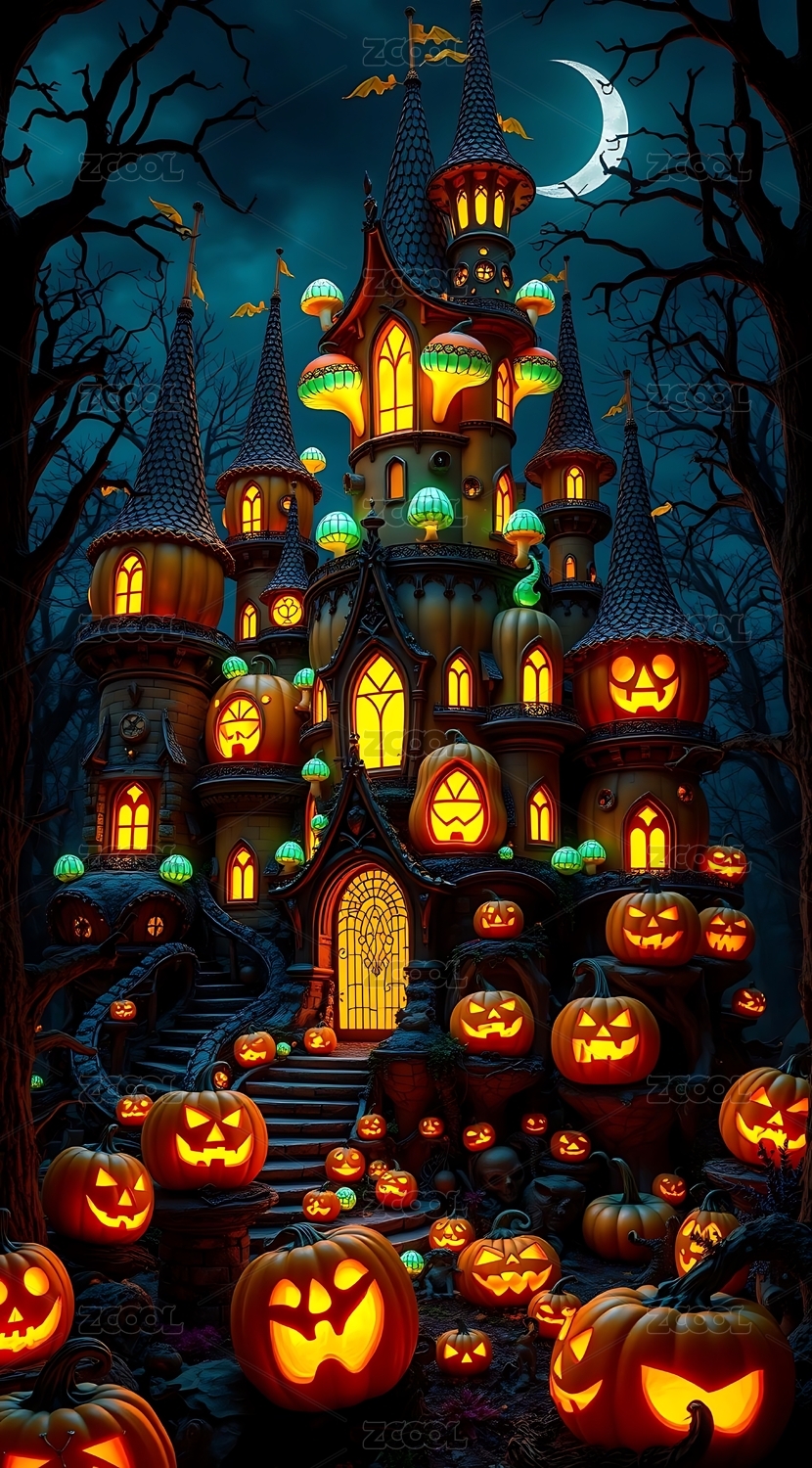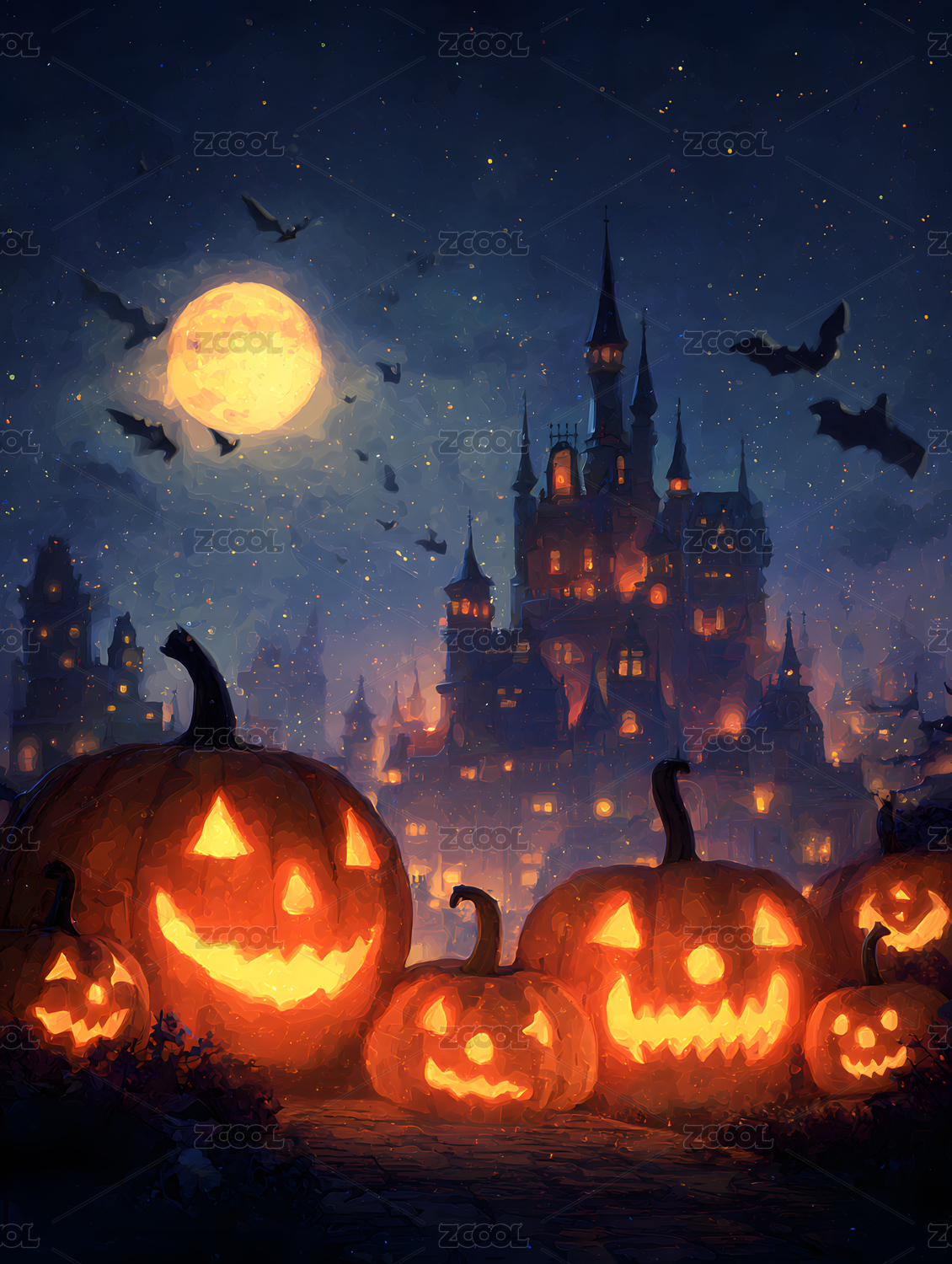 万圣节,南瓜,鬼魂,城堡,紫色,白底,场景,节日,氛围,竖屏