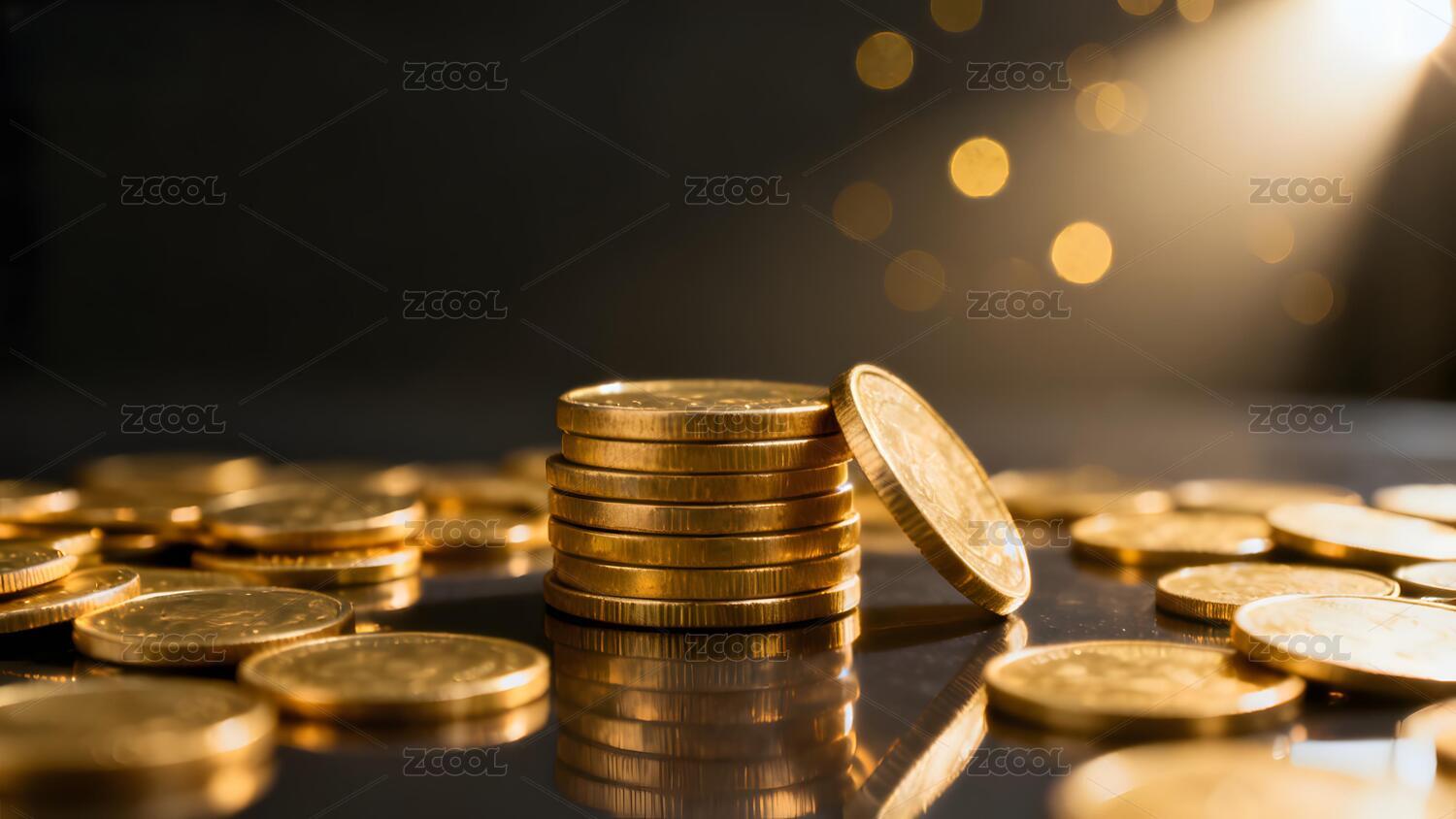 金币堆叠在反光桌面上