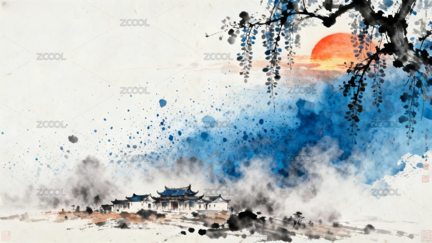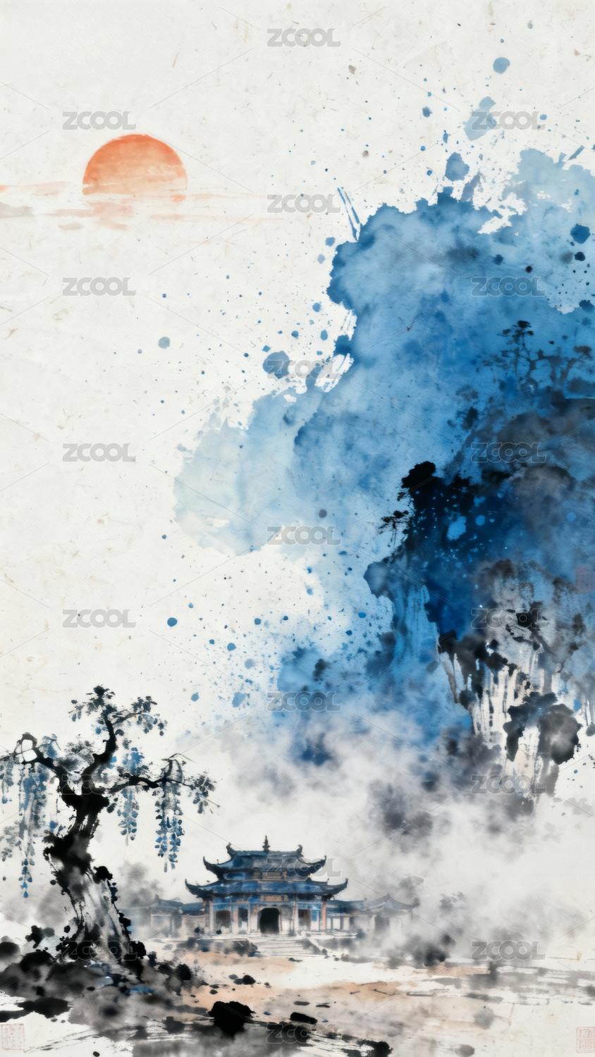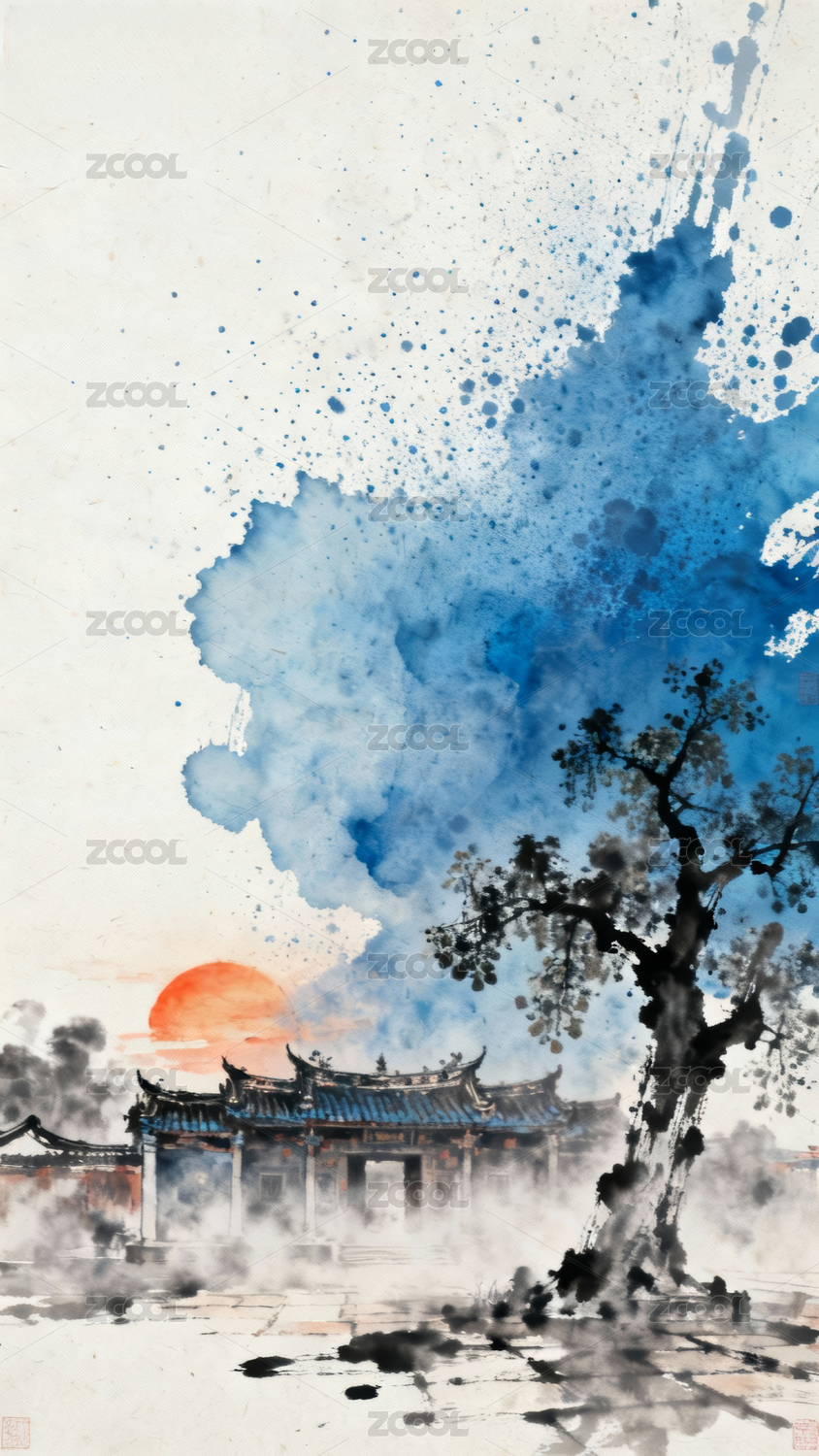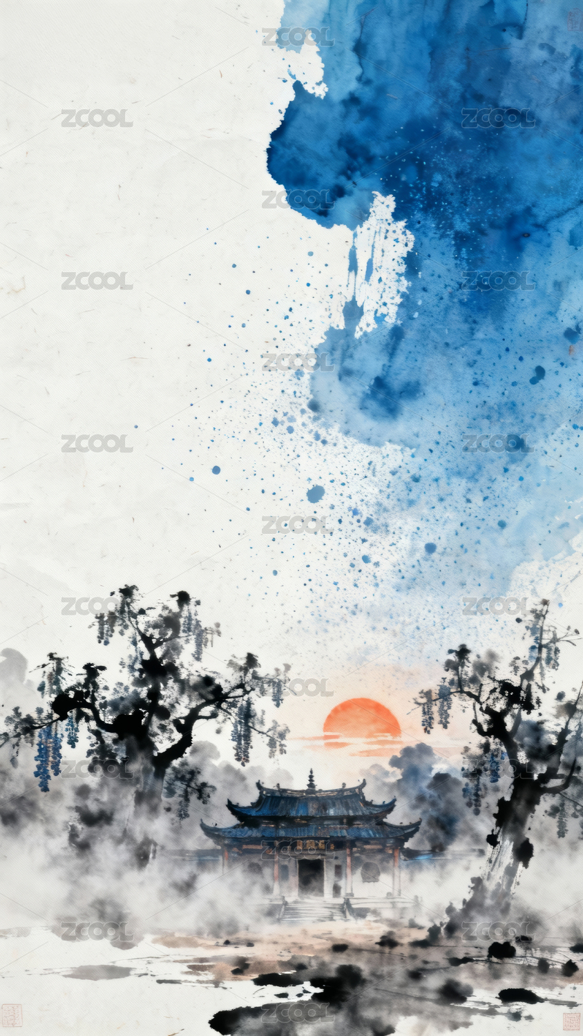 山水, 水墨, 树木, 云雾, 远山, 意境, 橙色, 传统, 自然, 风景