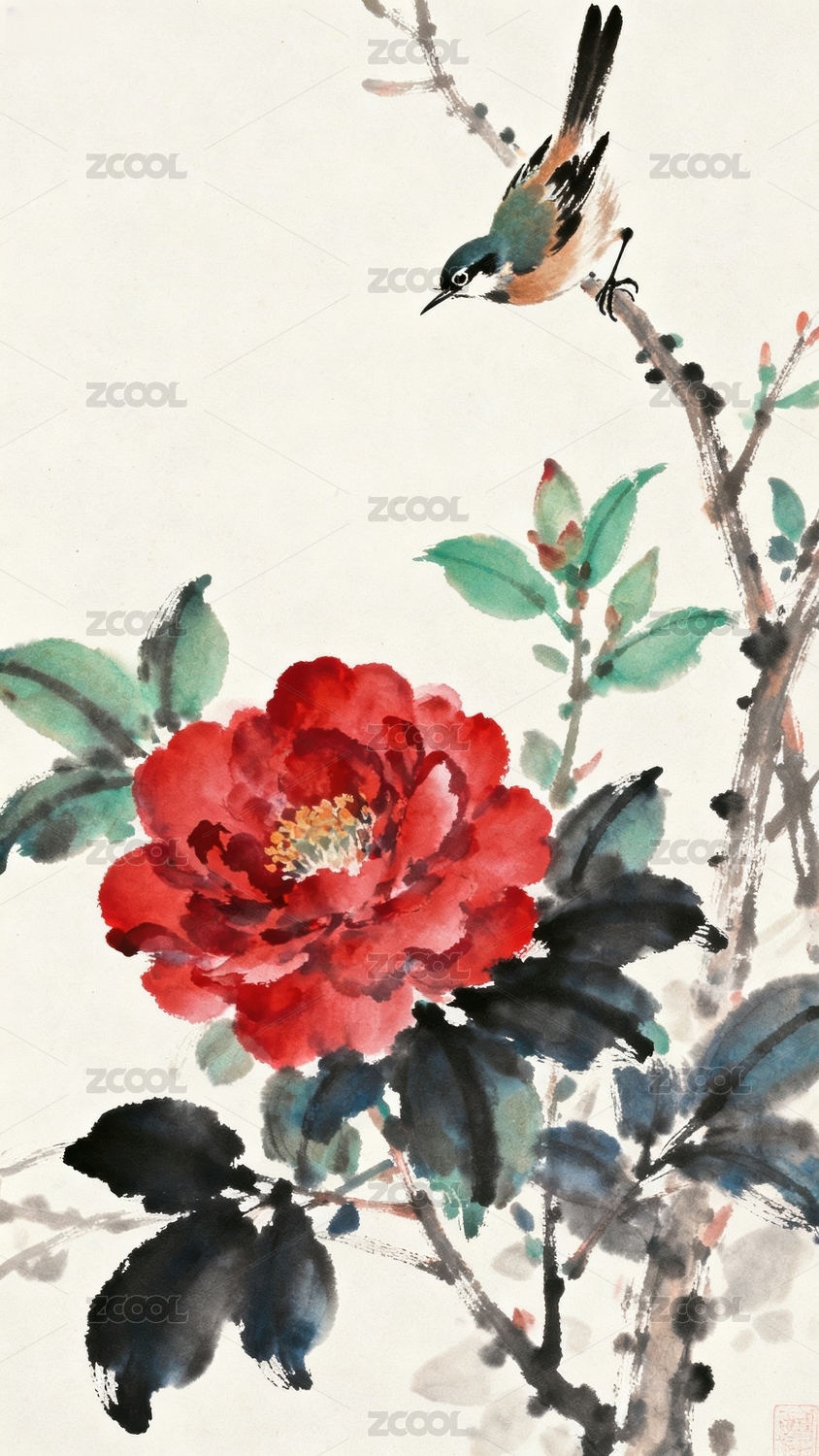 水墨画中的小鸟与花卉