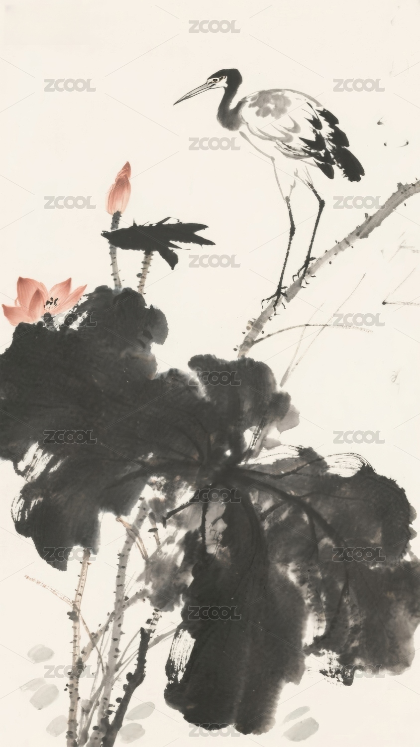 水墨画中的鸟与莲花