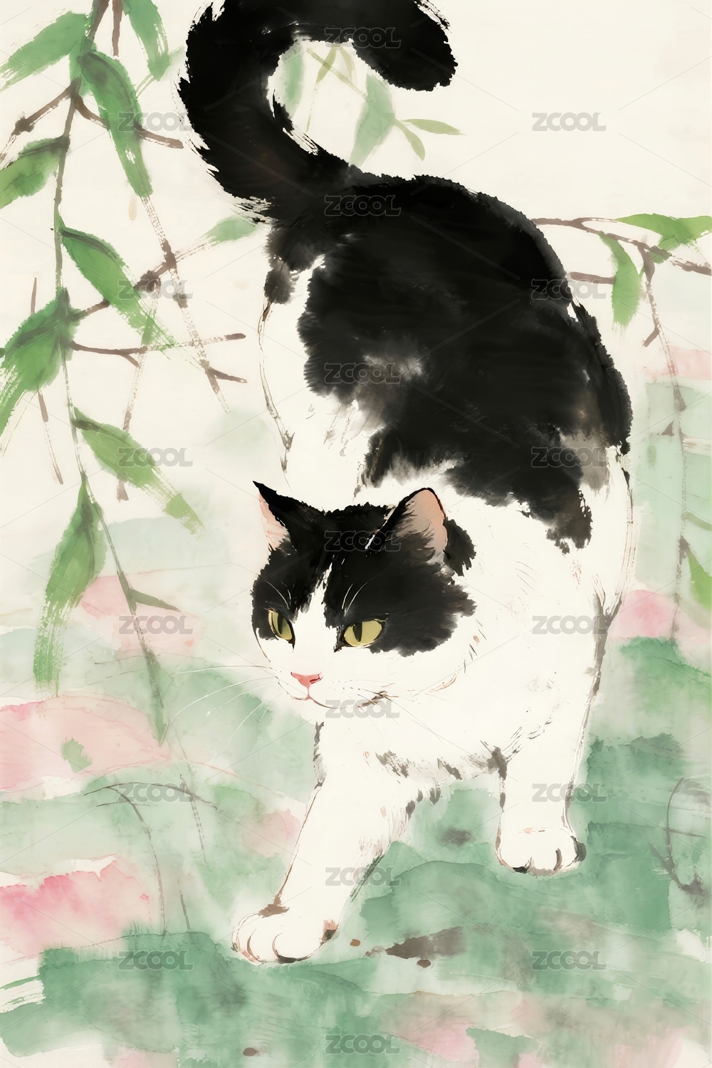 花猫水墨风花枝场景