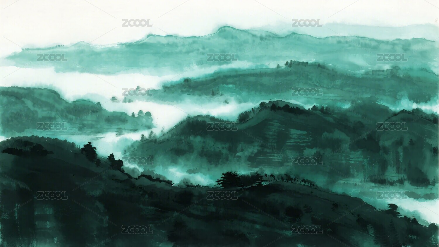 中式水墨绿色山水插画背景壁纸