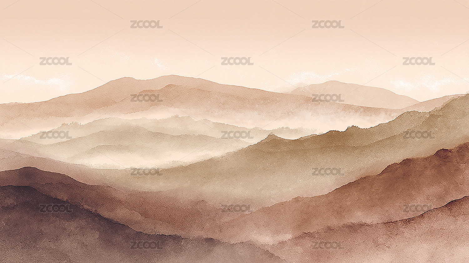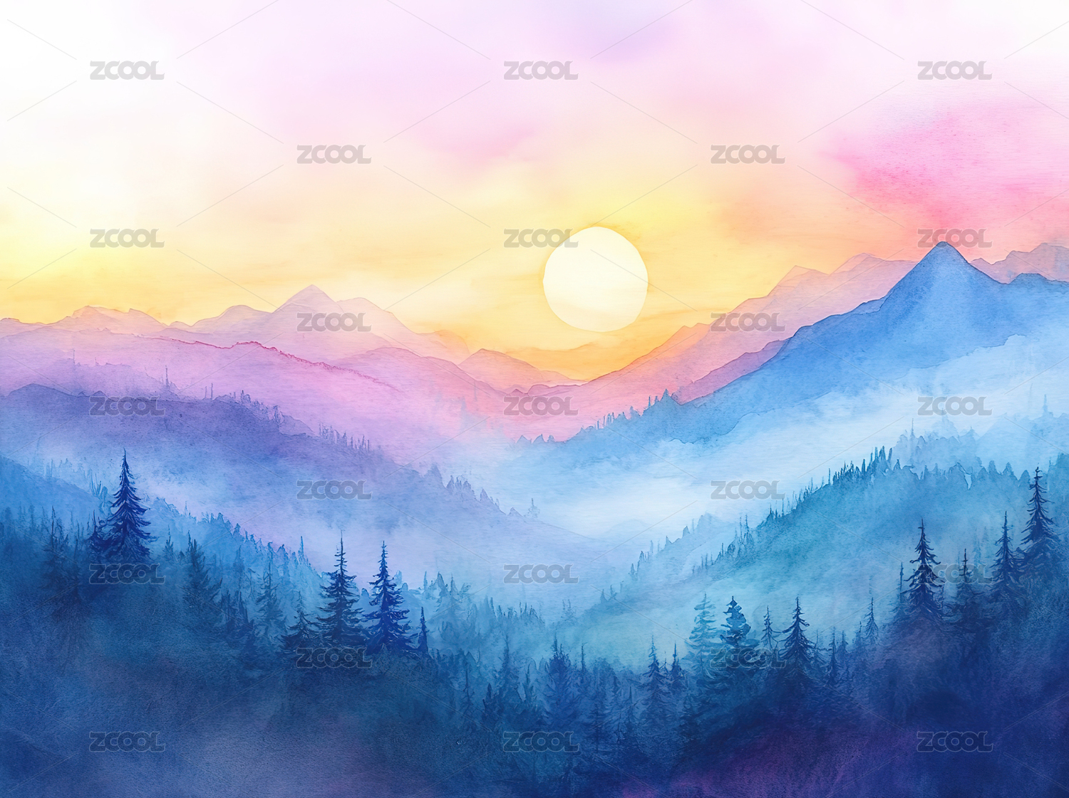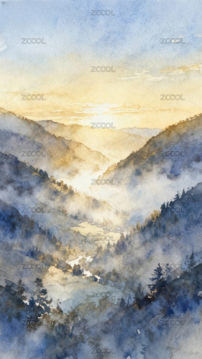 绘画, 自然, 宁静, 意境, 远山, 树木, 水彩, 风景, 雾气, 艺术