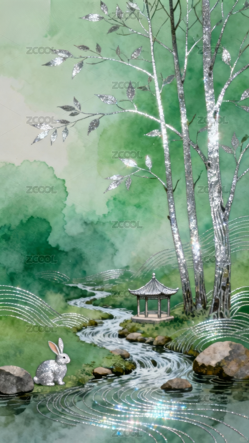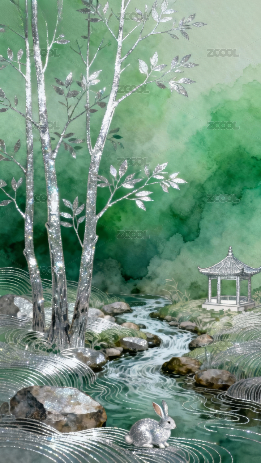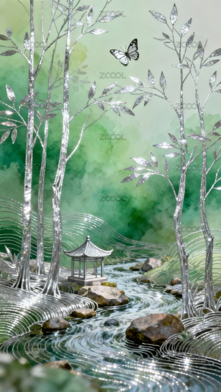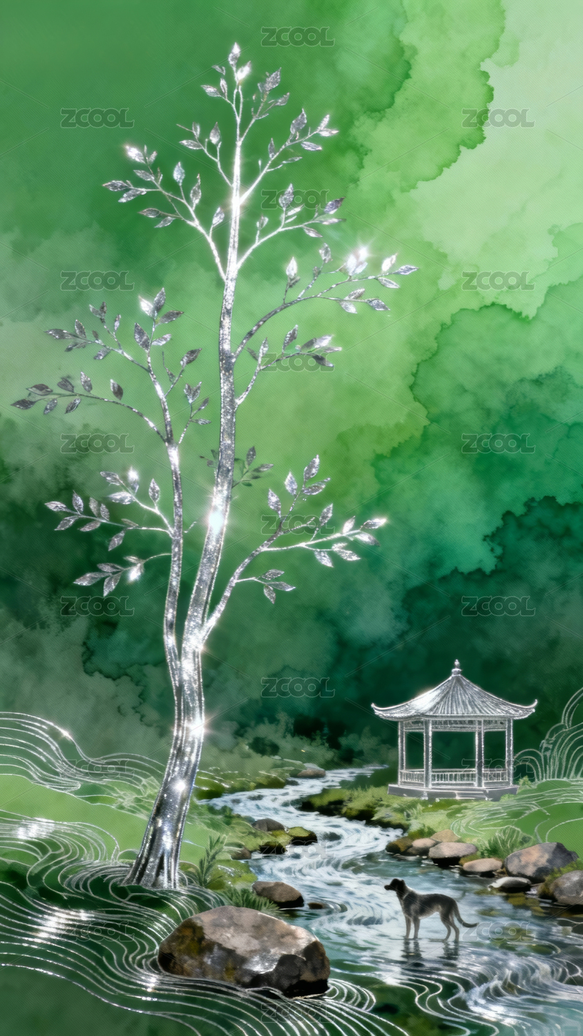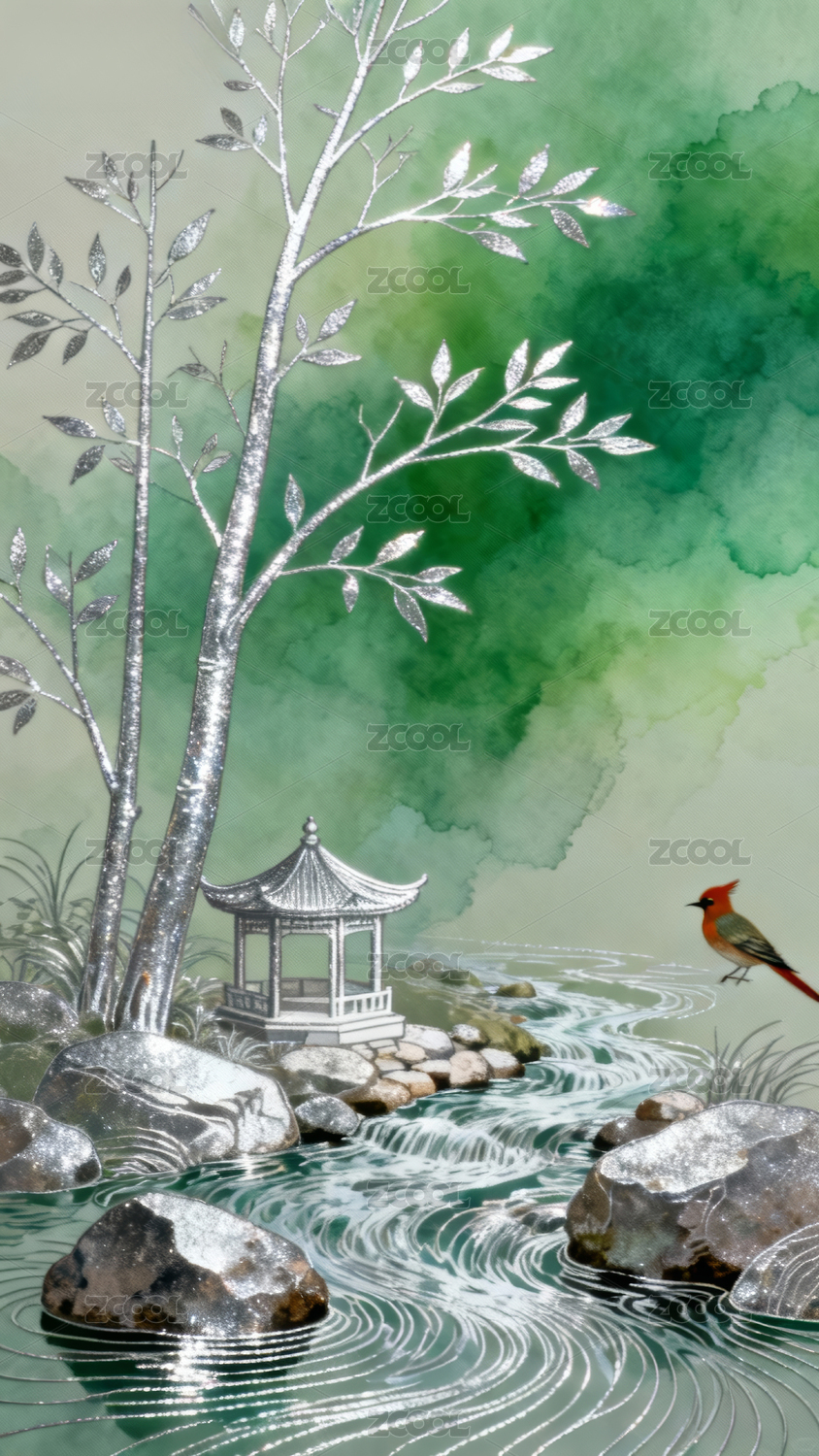 树木, 自然, 风景, 水墨, 艺术, 画作,山水, 溪流, 石头, 绿意