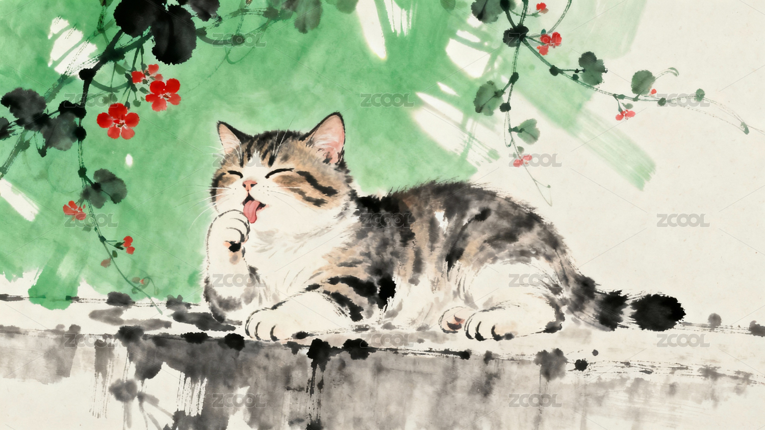 国风传统水墨工笔画慵懒的猫咪艺术背景
