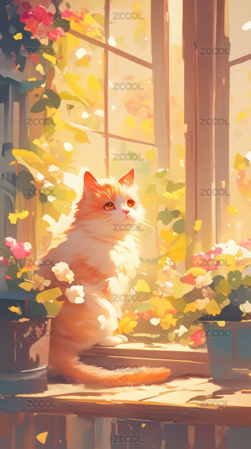 阳光下窗台上的猫咪与花草