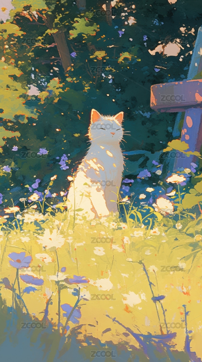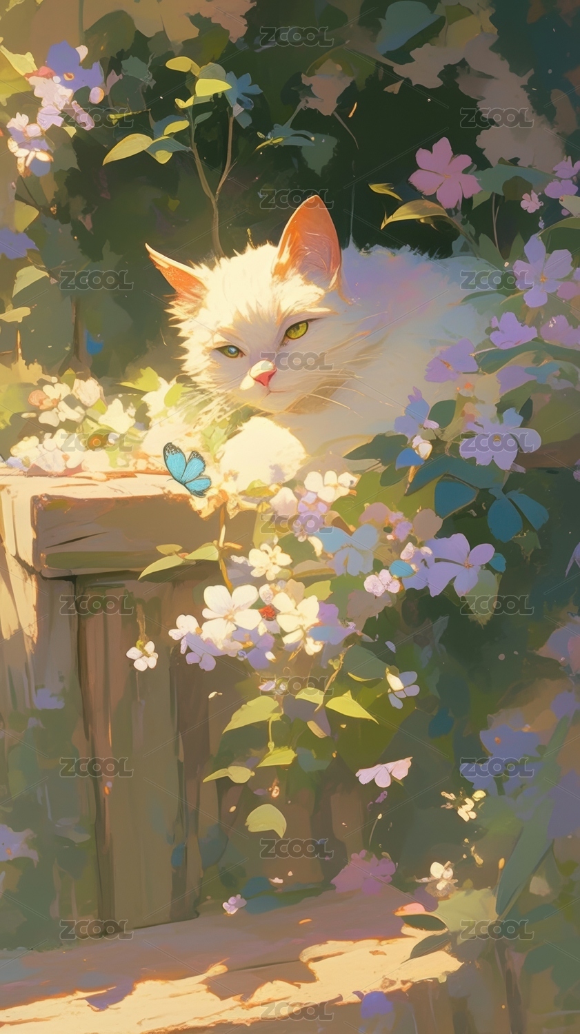 阳光下的猫咪与花丛