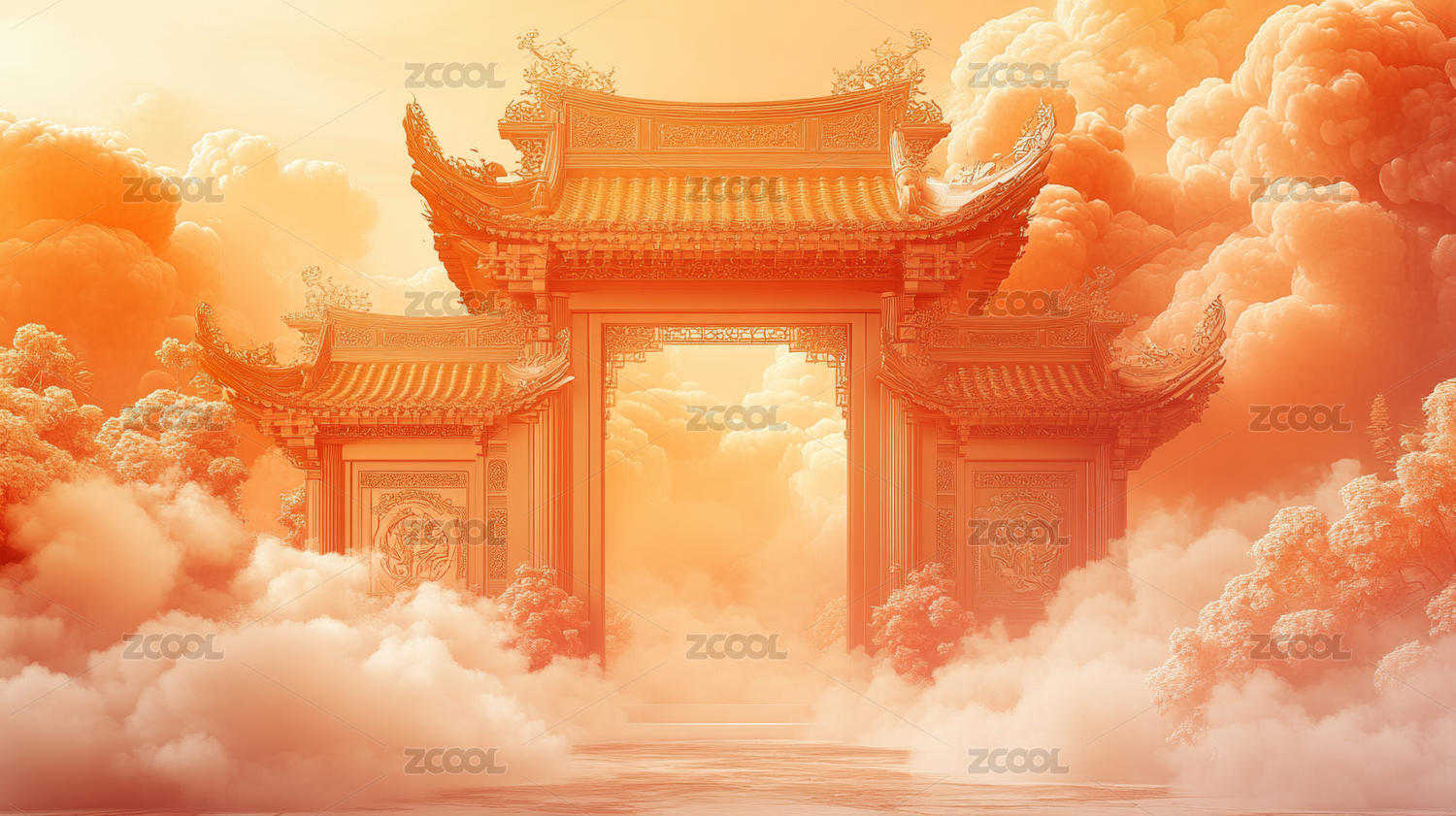 牌坊,云海,中式,仙境,传统,建筑,橙色,梦幻,天堂,门户
