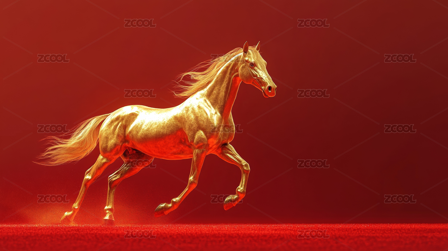 中国风金色汗血宝马奔跑的红色喜庆背景