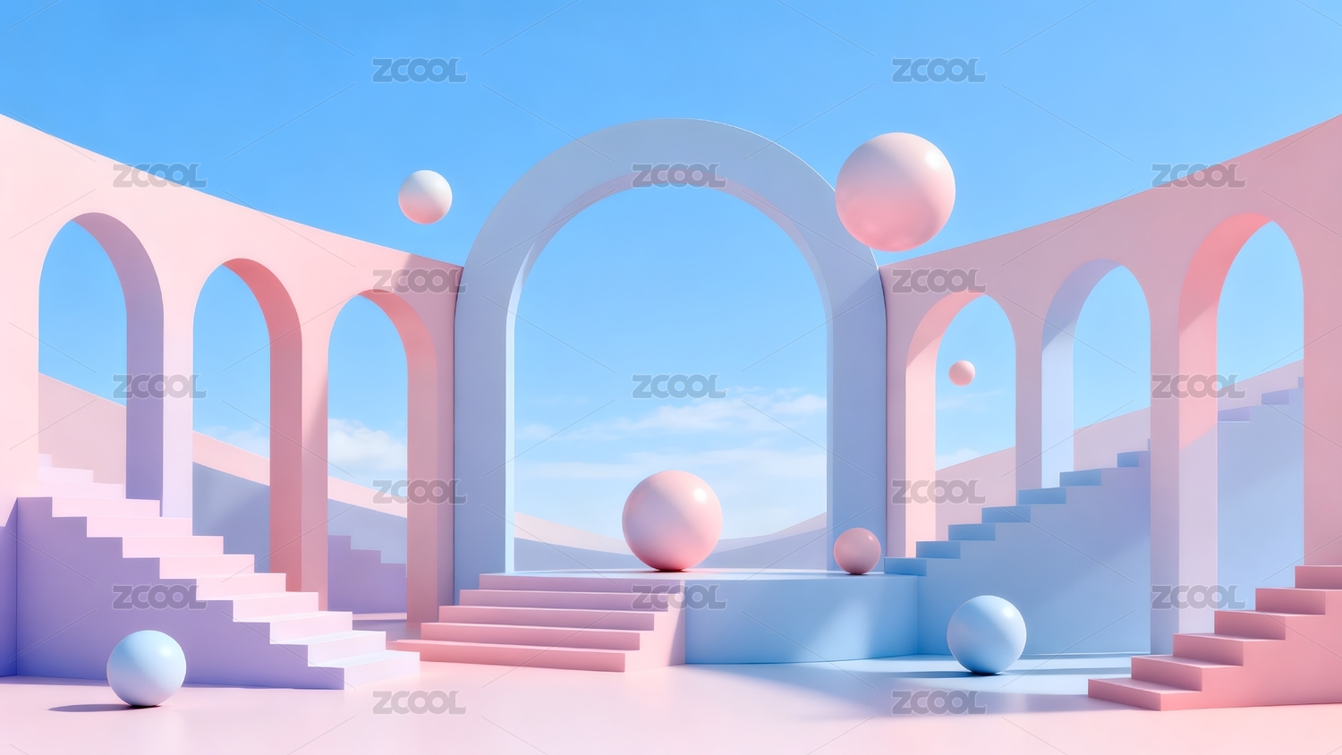 梦幻天空下的粉色抽象拱门建筑