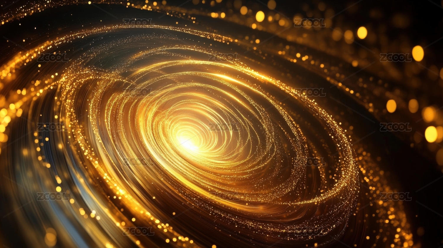 黑色背景下的金色粒子流动的漩涡抽象背景图