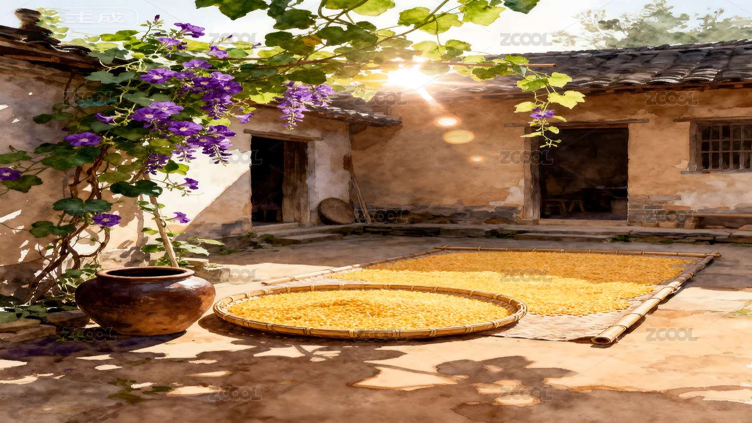农家,小院,秋收,晒秋,老房子,稻草堆,玉米,竹匾,乡村,生活