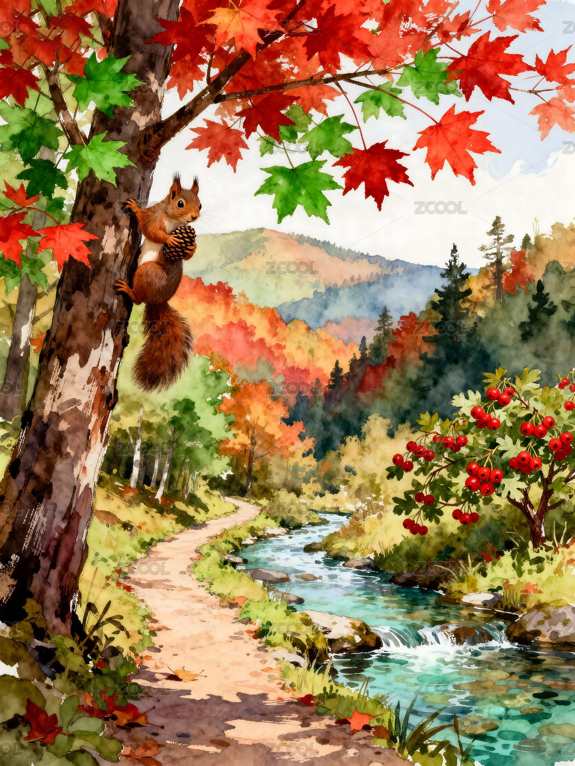 秋天,枫叶,松鼠,溪流,树林,落叶,树桩,松果,秋色,森林