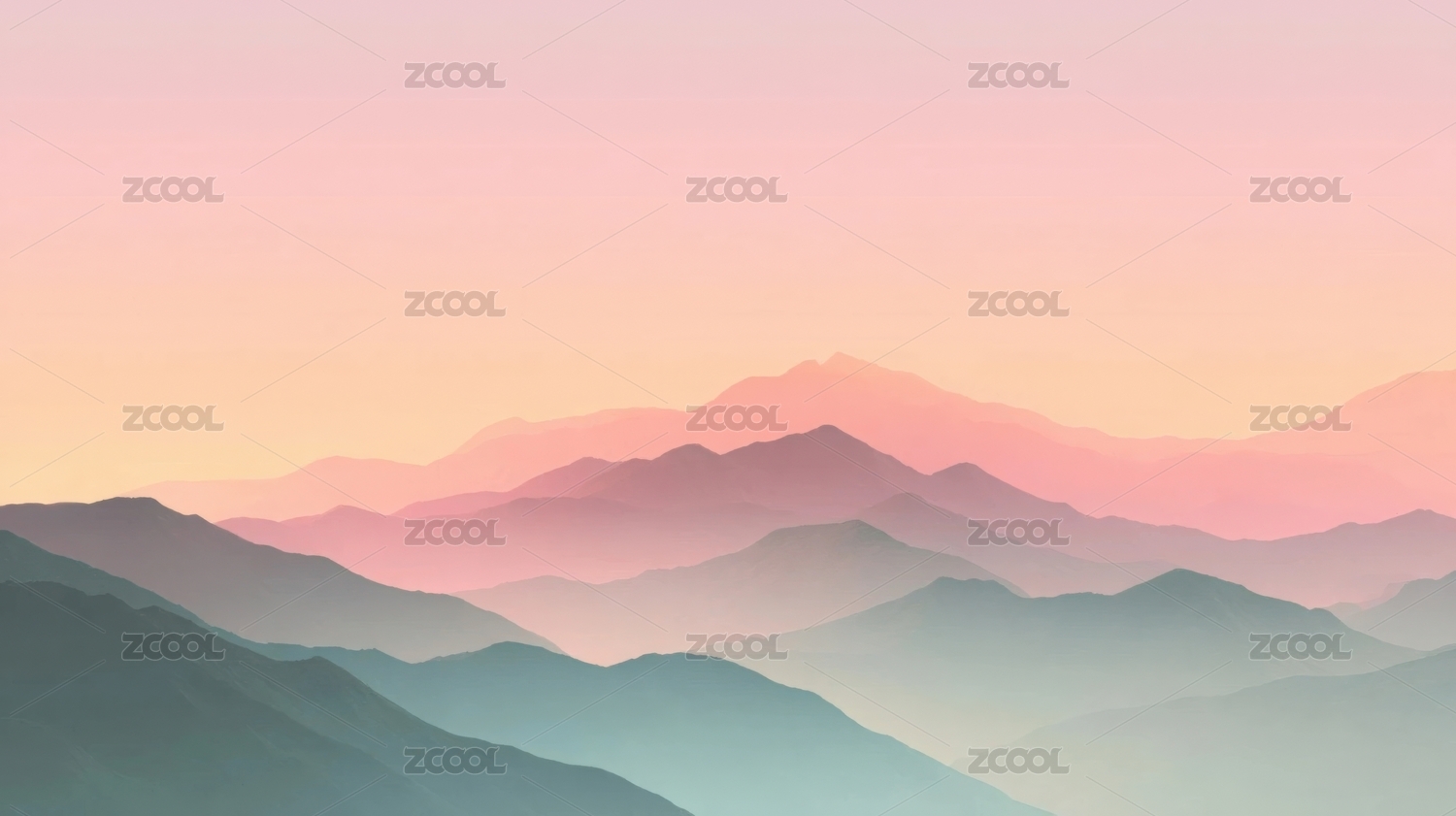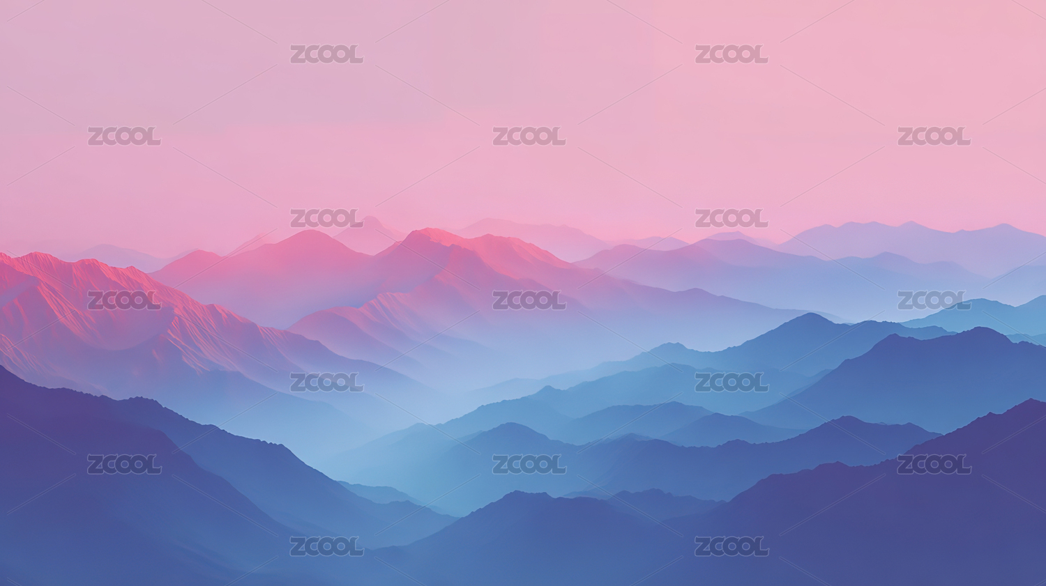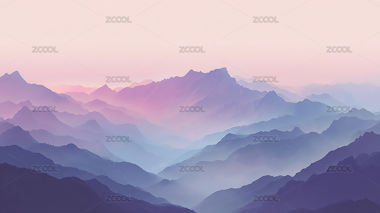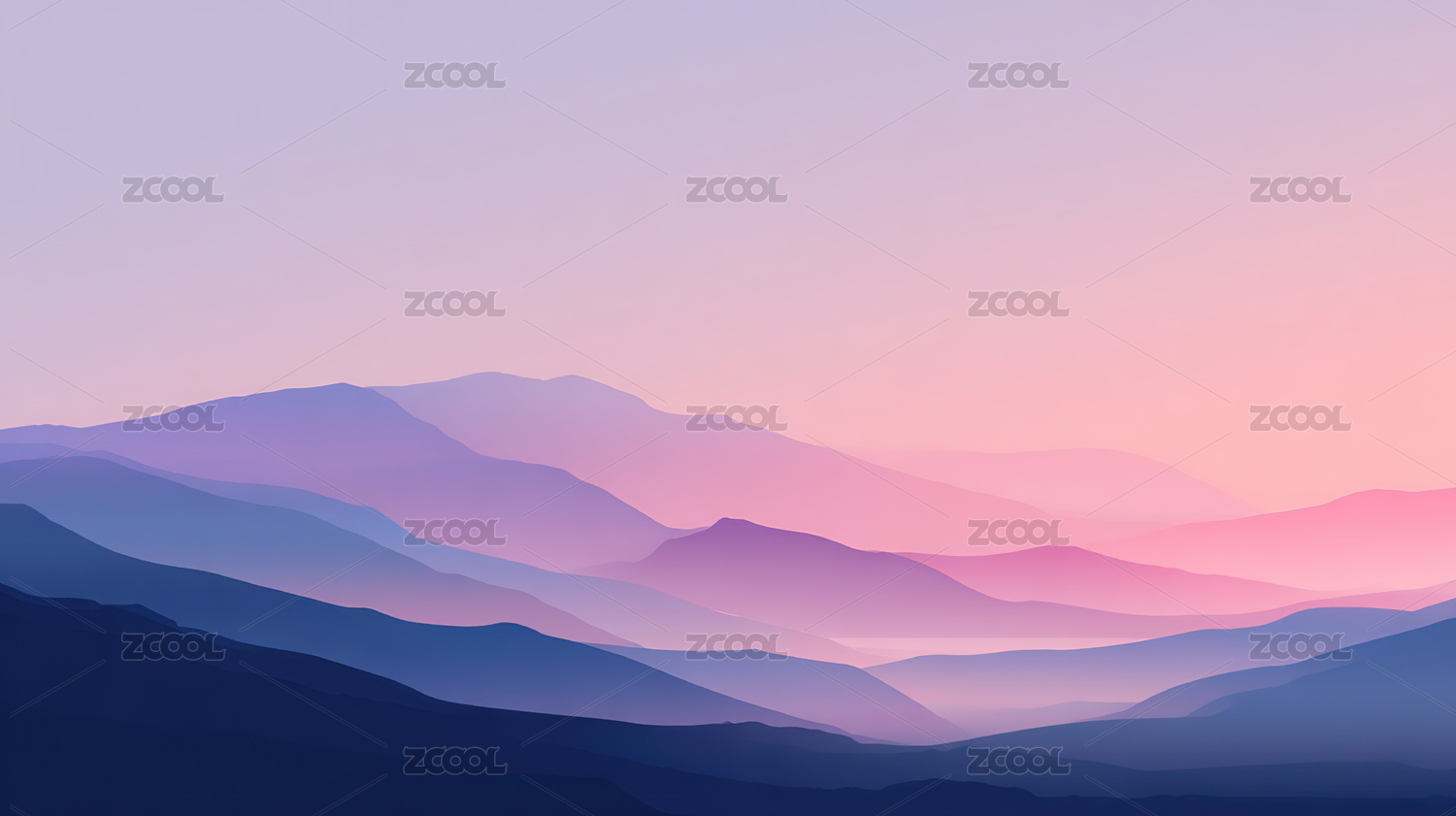 粉紫渐变天空下群山层叠呈现梦幻清新的插画