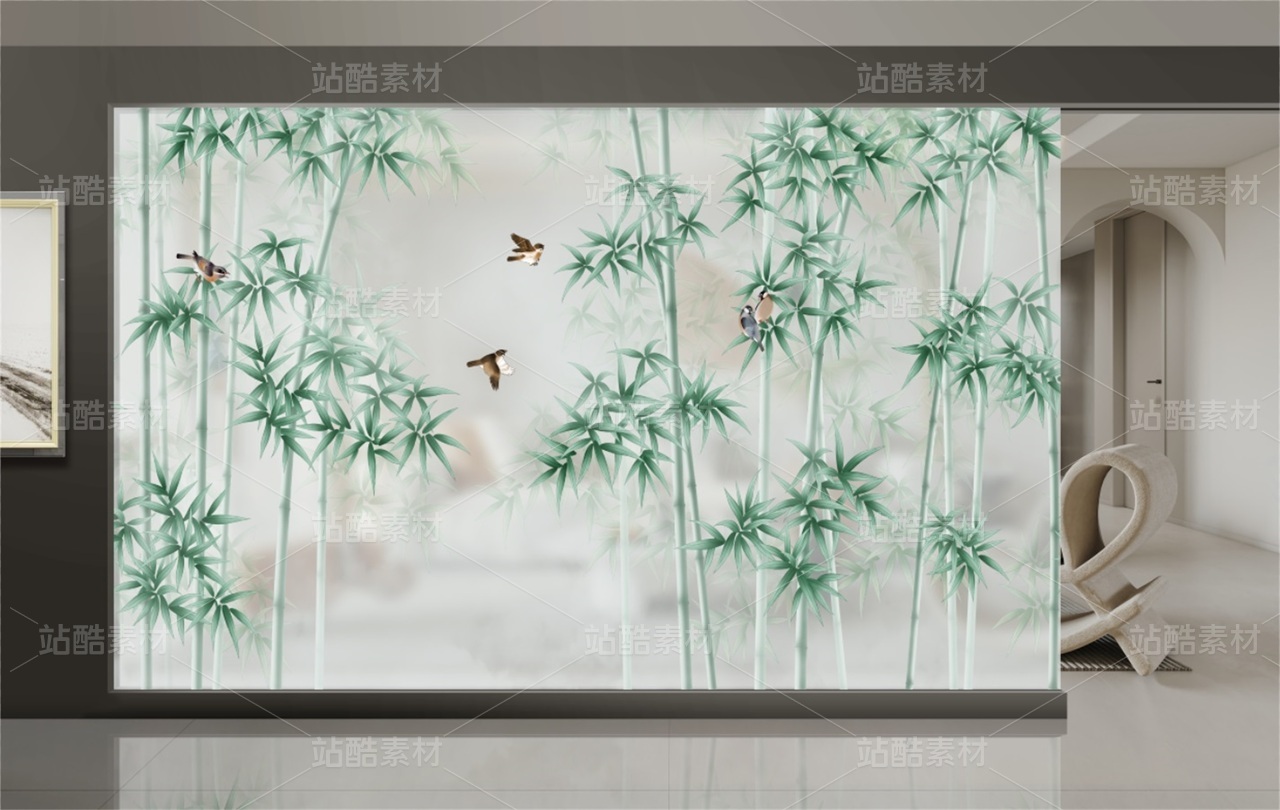 抽象竹鸟装饰画 新中式竹子画 朦胧竹子 适用于家装,酒店,文化场所等,用于做:背景墙、隔断、移门,屏风、玄关。高清分层图可以用UV打印。