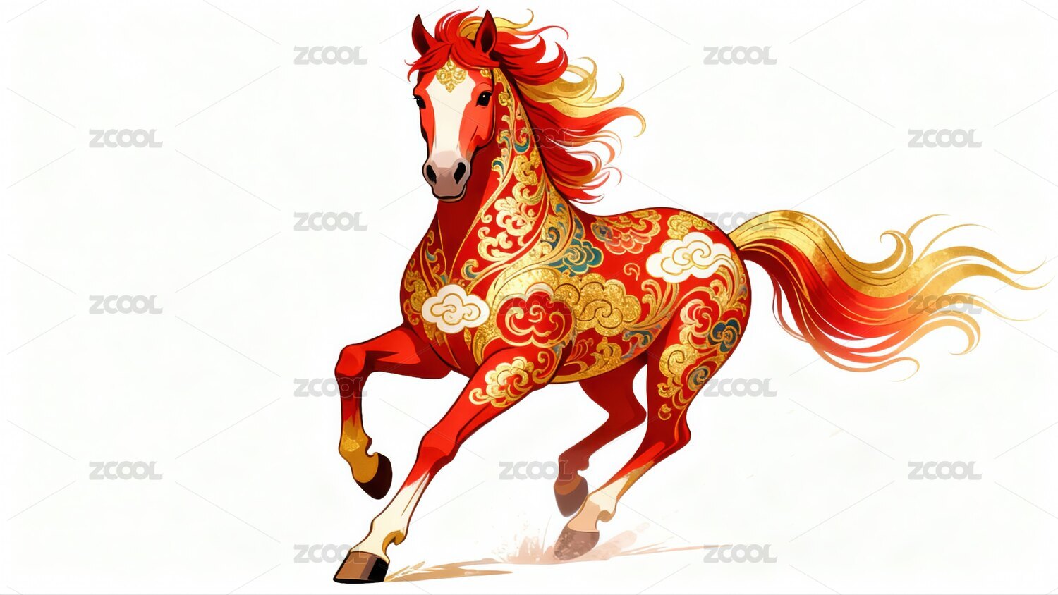 金色骏马奔腾于红色背景之上