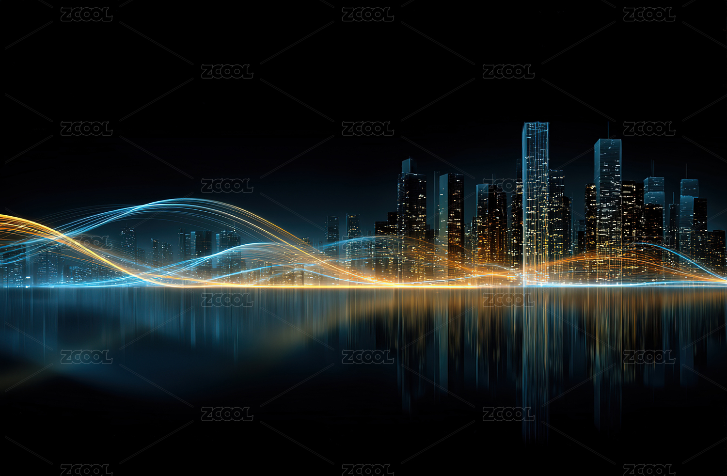 金色光波与城市夜景倒影