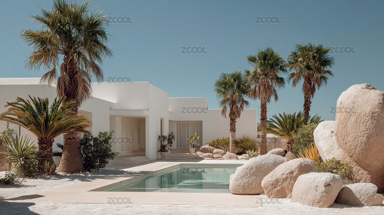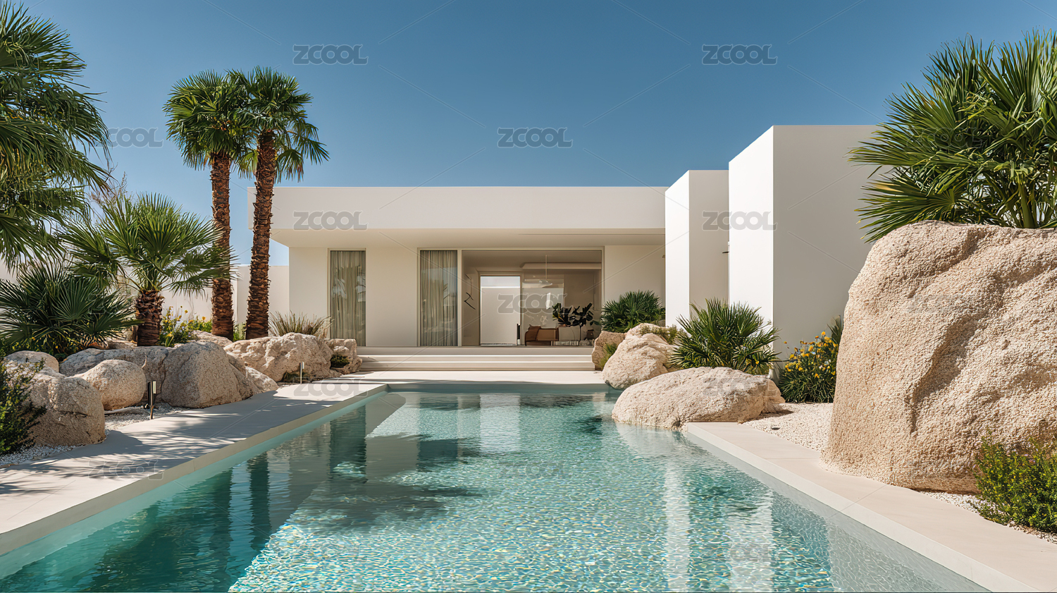 现代泳池别墅与棕榈树景观