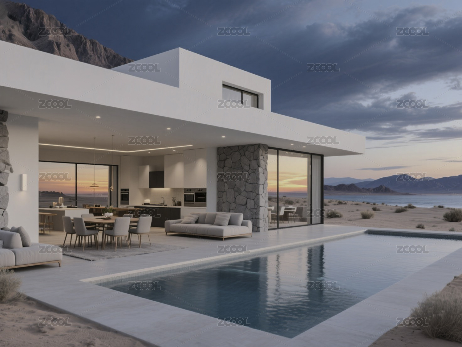 现代白色别墅与泳池的沙漠景观