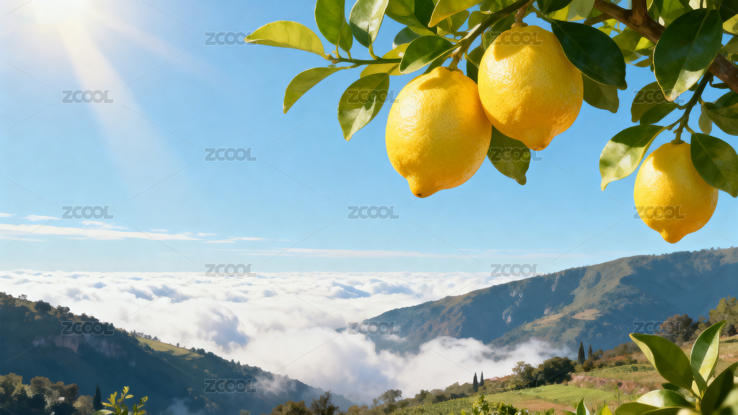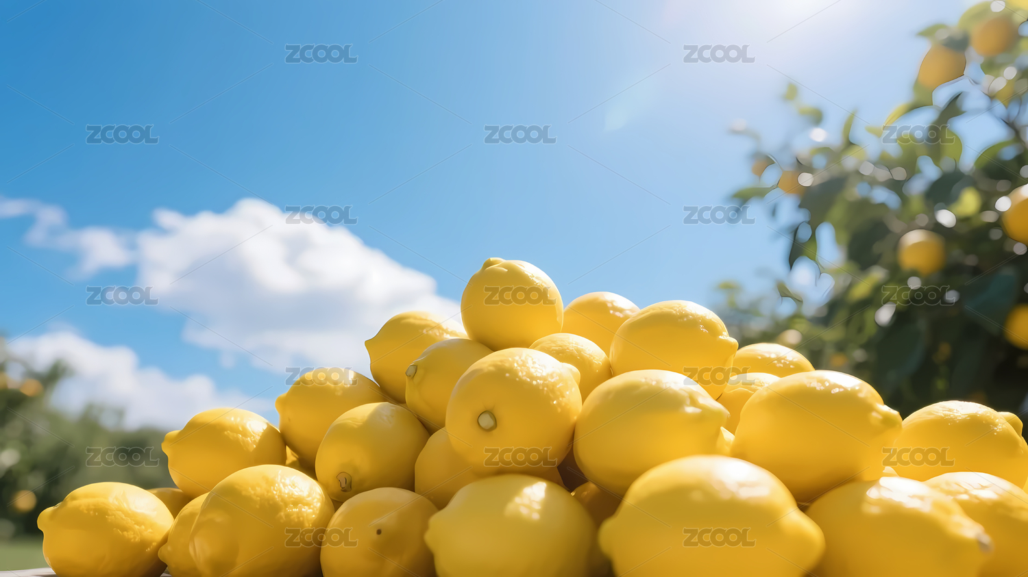 柠檬,果树,枝头,鲜果,绿叶,蓝天,阳光,光芒,光线,光斑