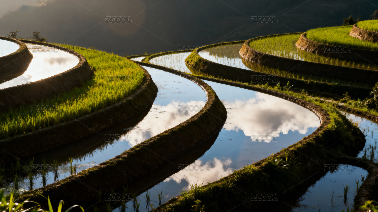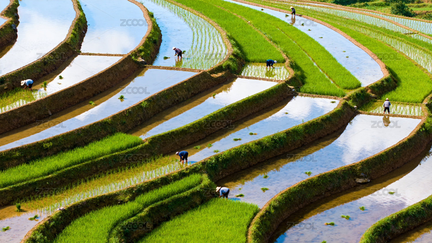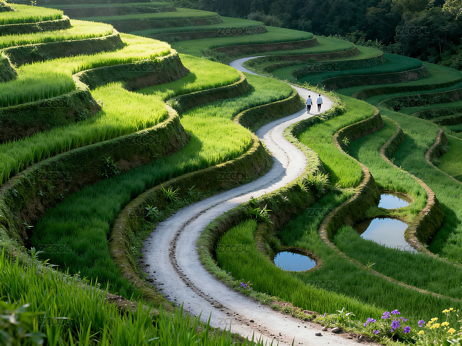 梯田,稻田,农田,绿色,小路,小道,土路,行人,步行,背影