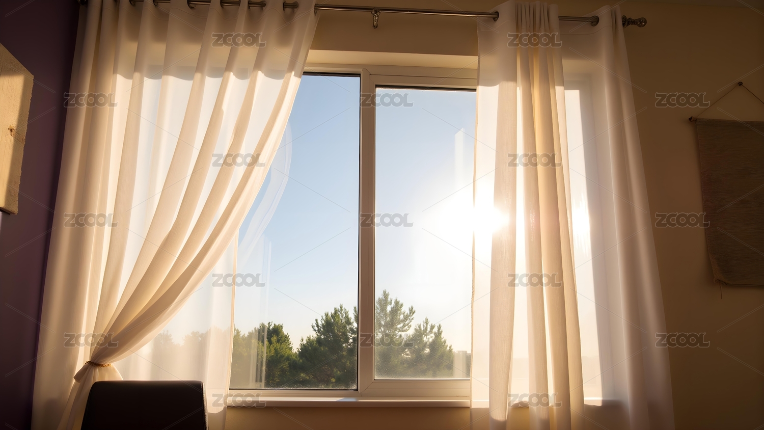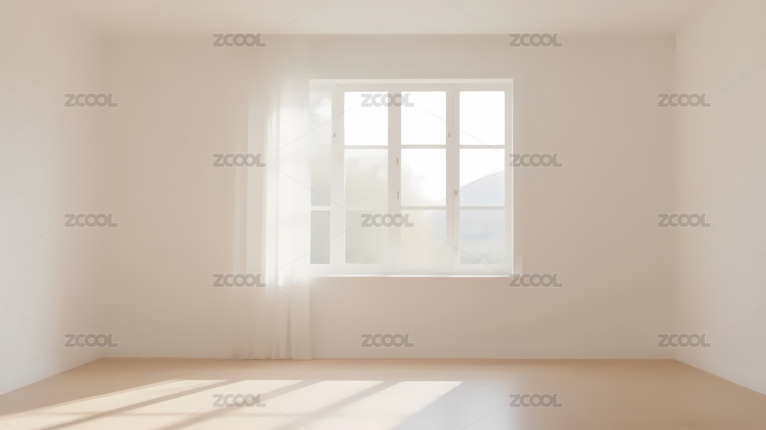 明亮的空房间与穿过窗帘的阳光光,三维渲染