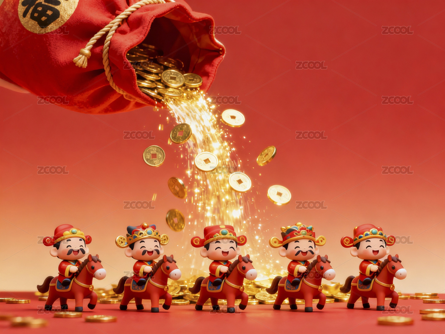 春节福袋金币洒落五路财神骑马