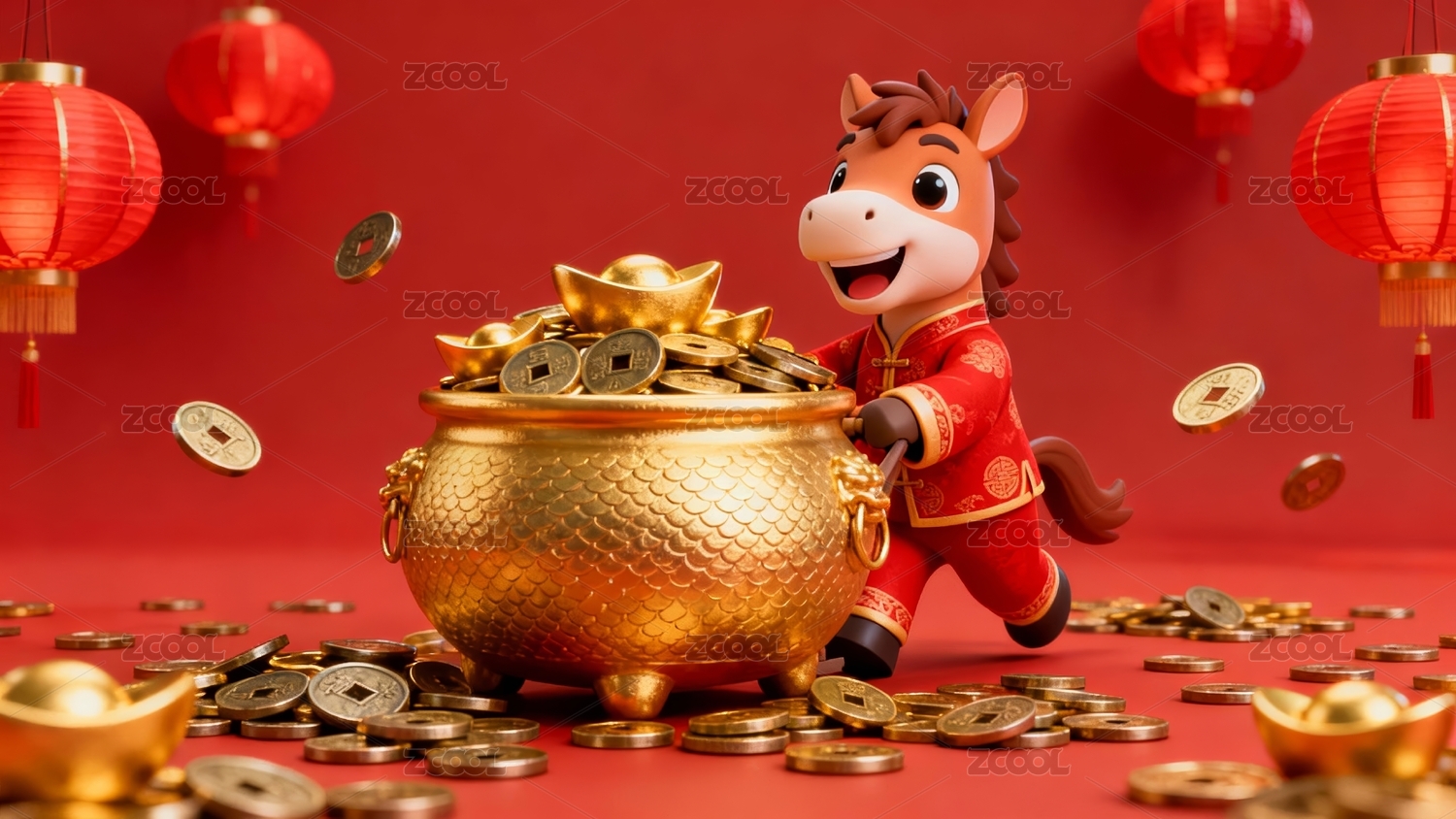 卡通马满载金元宝财富场景