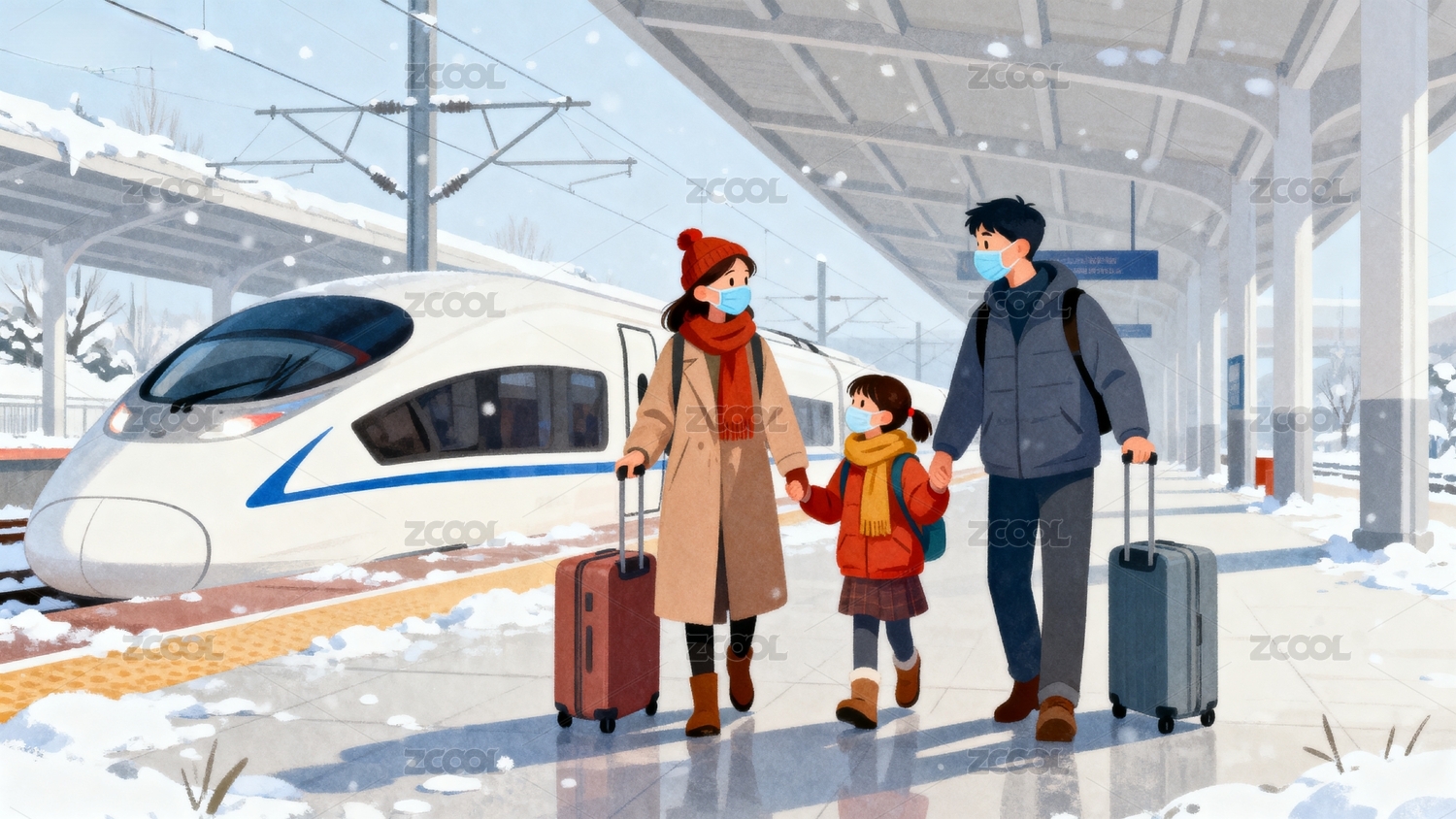 雪中车站母女与高铁