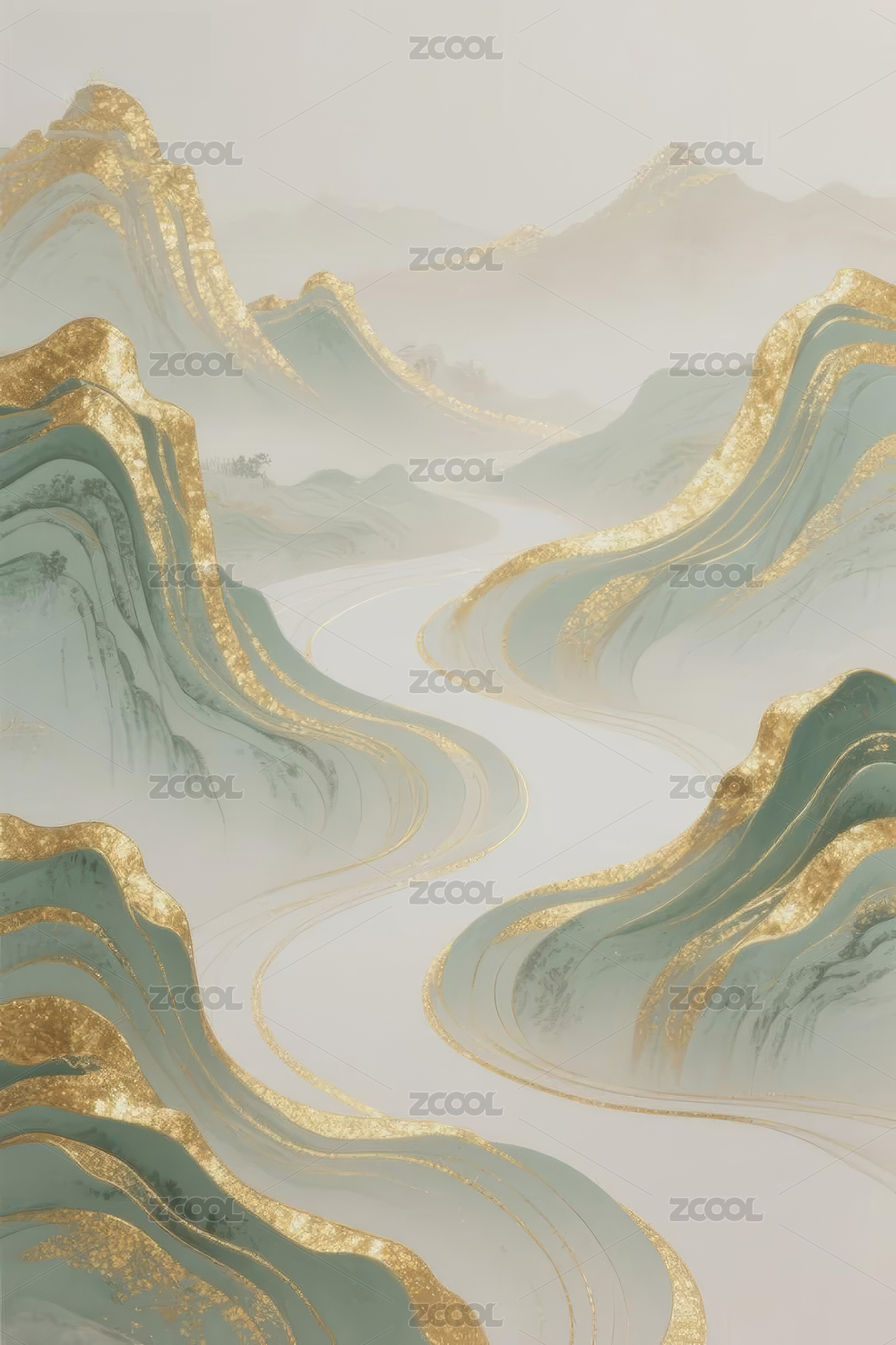 新中式梦幻绿白金色渐变山水画