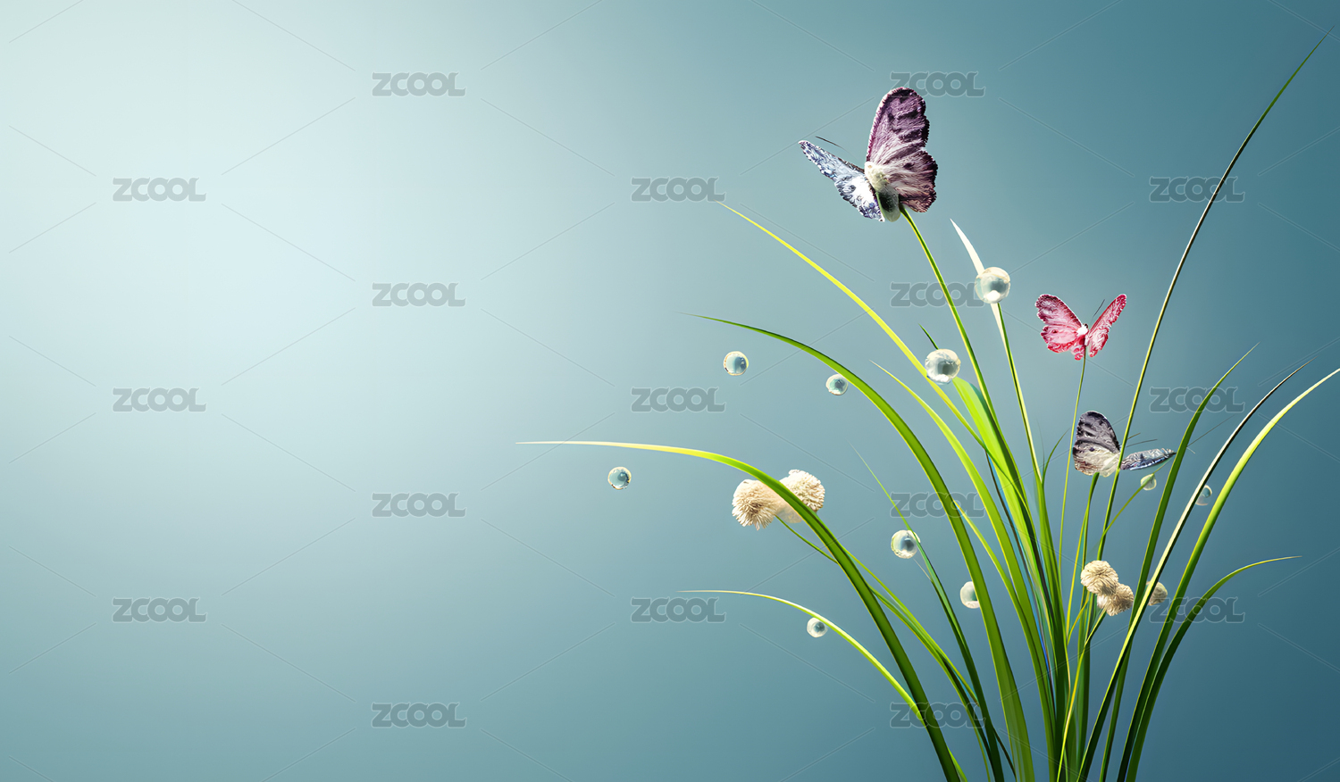 草丛和蝴蝶水墨绿调插画