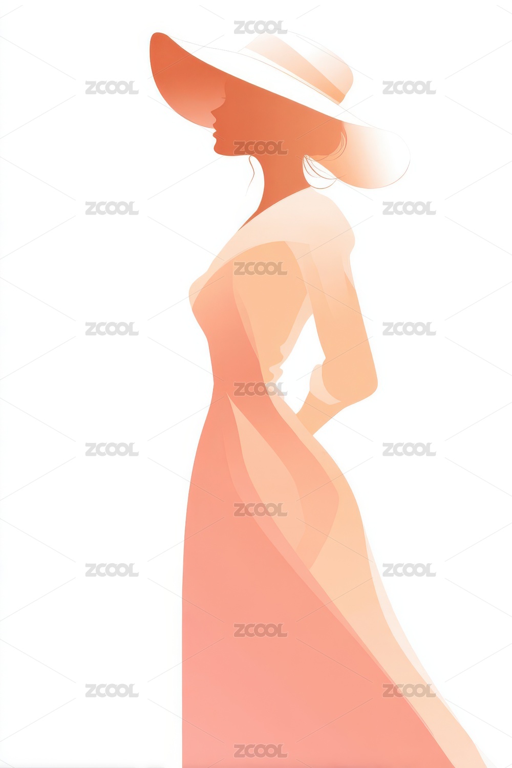 优雅女性身着粉色长裙与宽檐帽的侧影