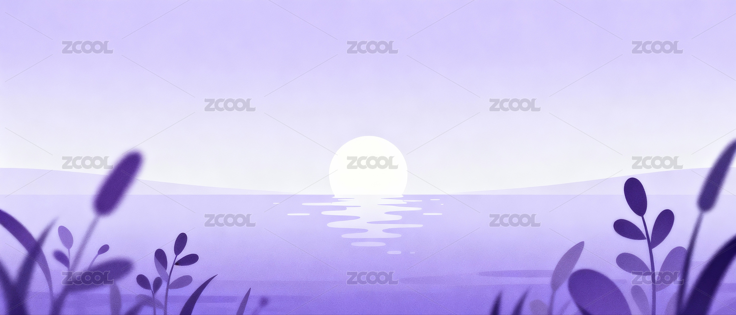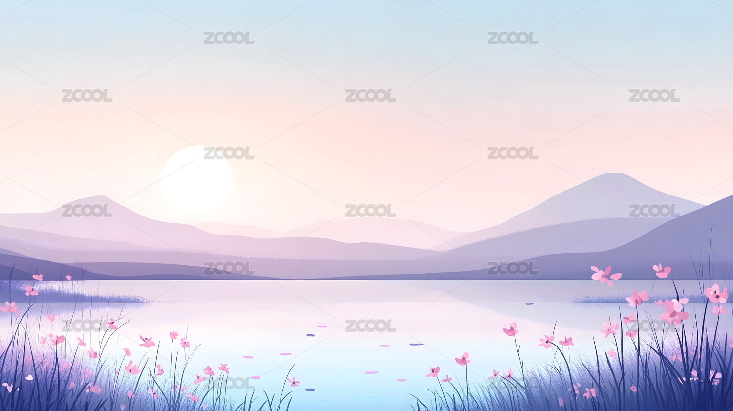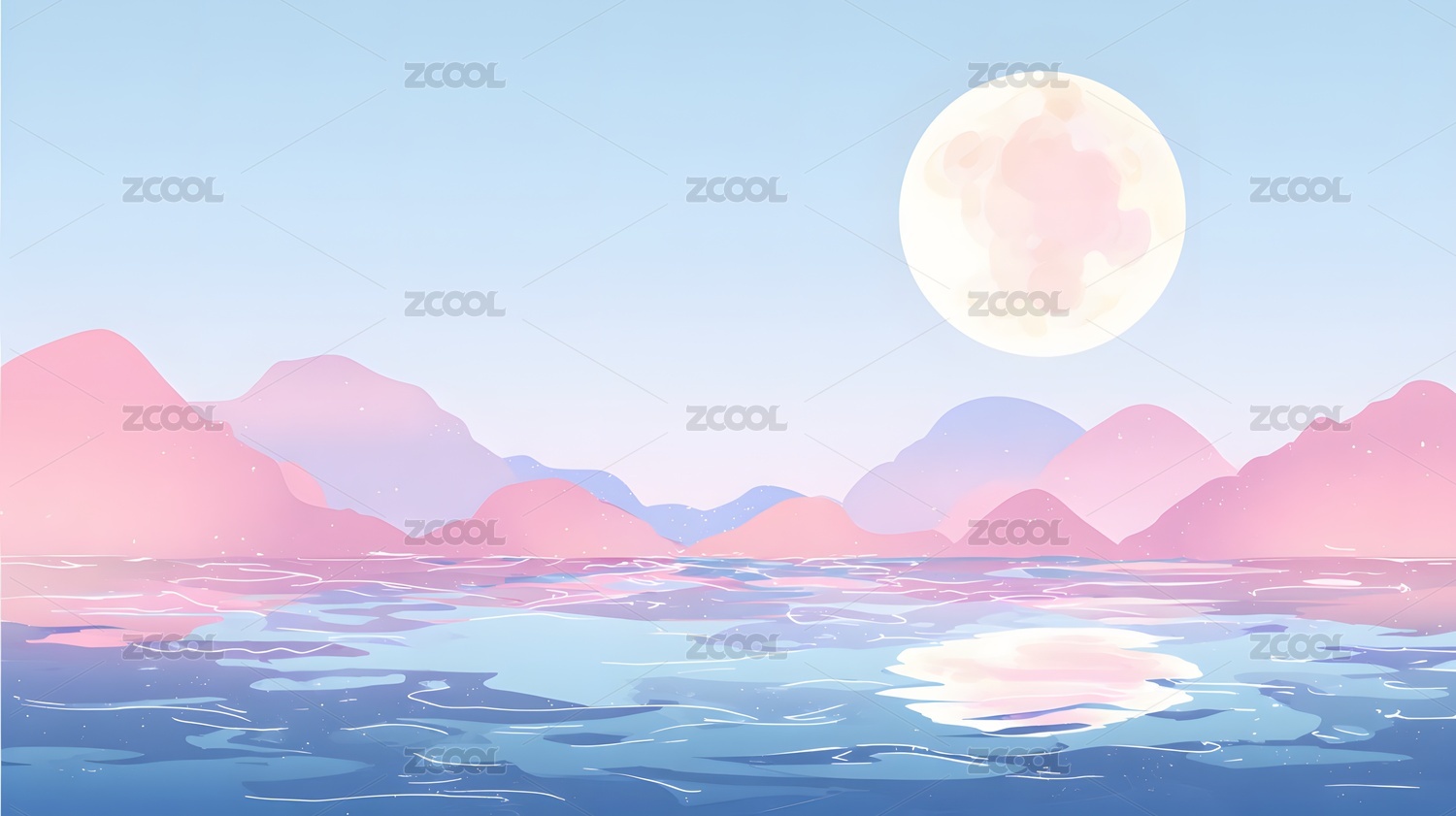 粉色山脉蓝色湖水倒影中秋月色山水插画