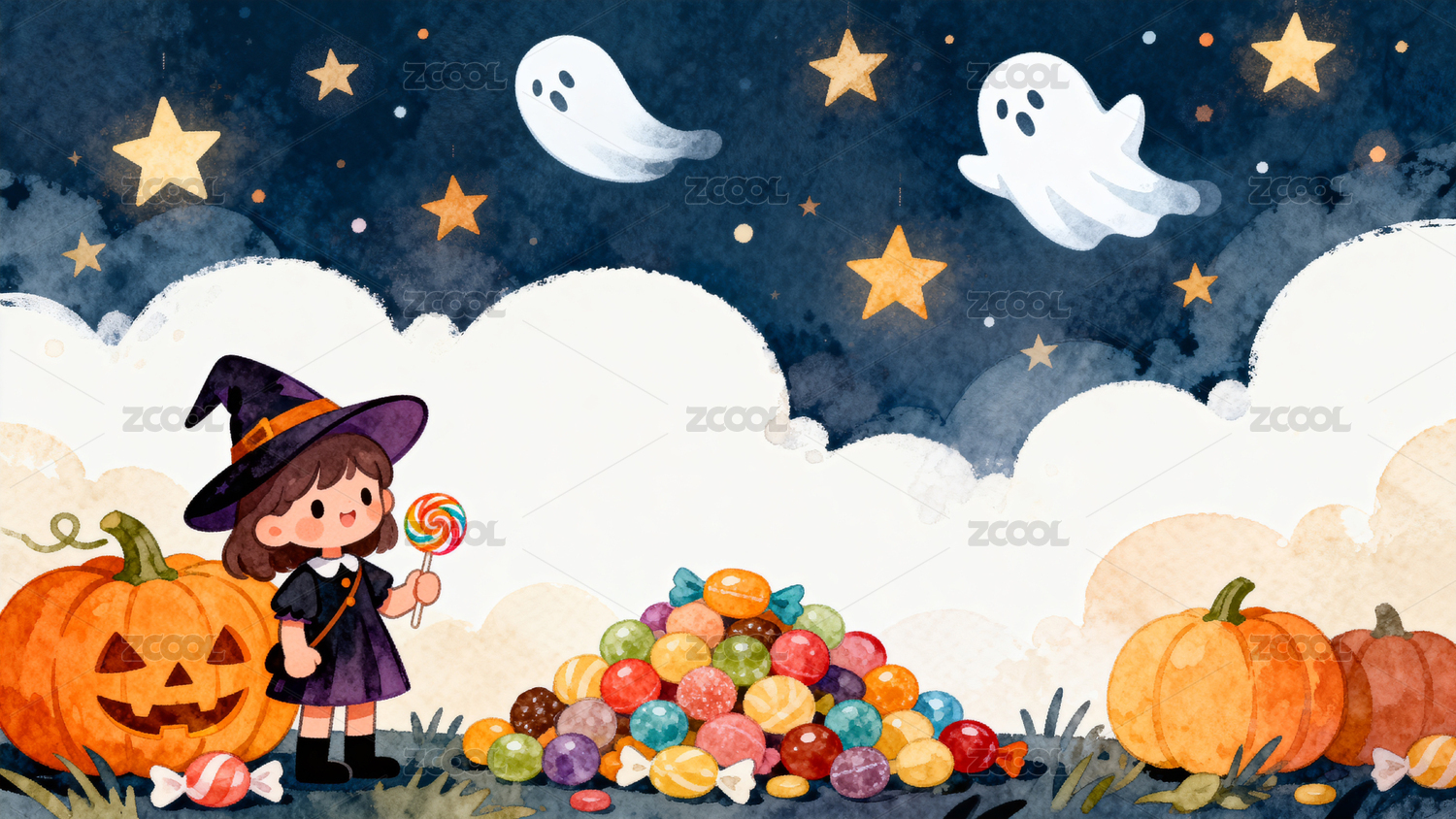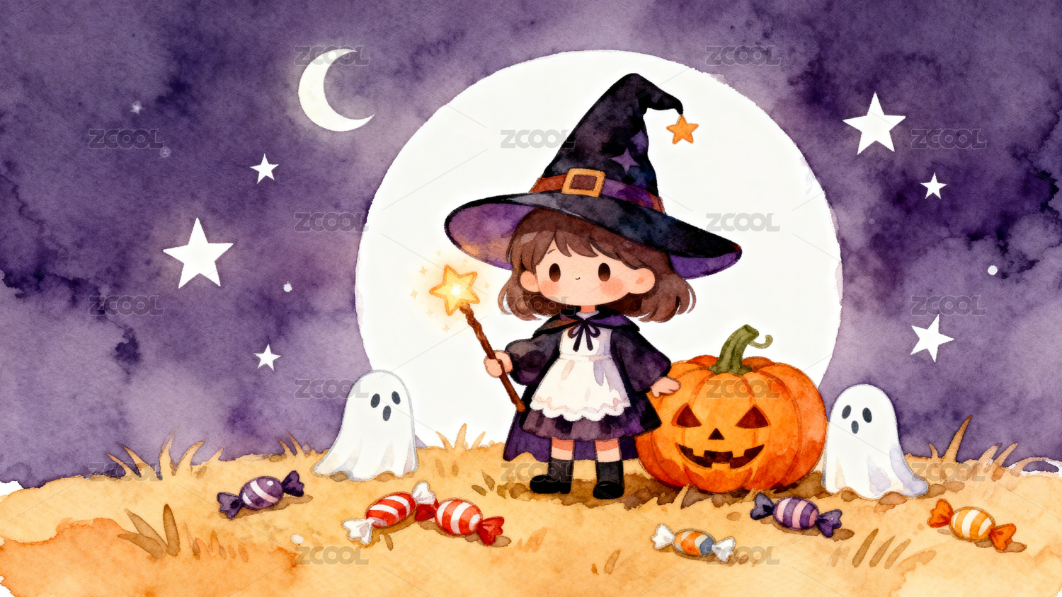 万圣节之夜邪恶月亮可爱提灯小巫女海报插画