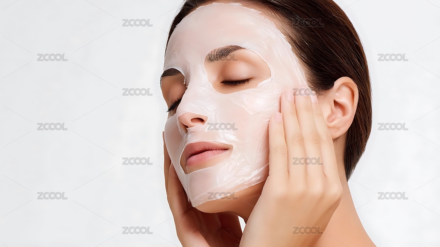 敷完面膜的女生双手揭开面膜,在白色的背景前