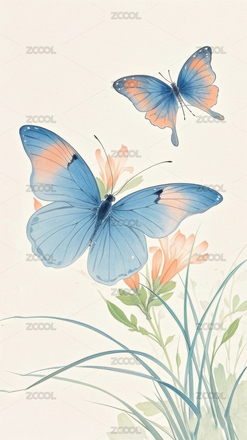 蝴蝶花枝国风插画场景