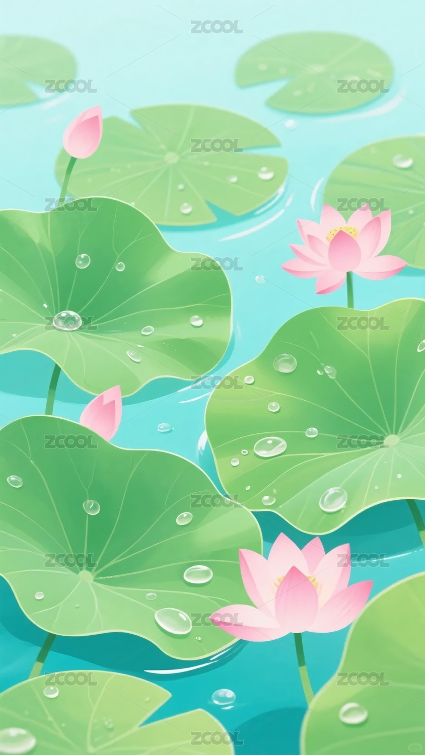 朵朵荷叶间有一个小小的荷花苞-夏季插画