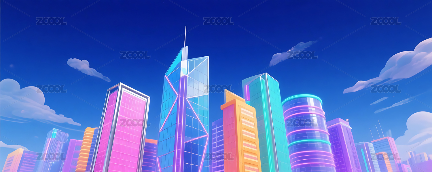 梦幻荧光色城市建筑赛博3D卡通立体插画