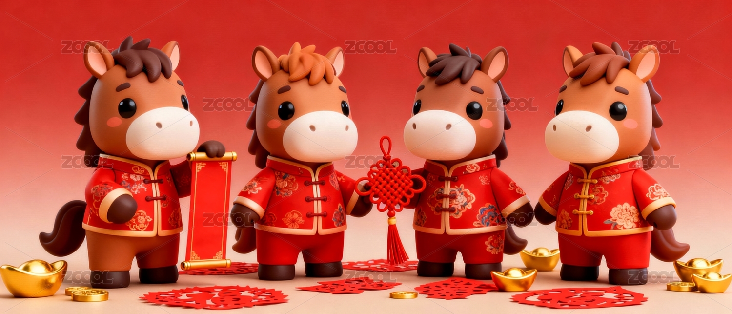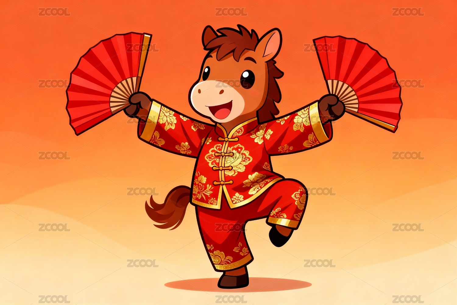 主视觉,商业,壁纸,萌马,喜庆,新年,多场景,唐装,折扇,红包
