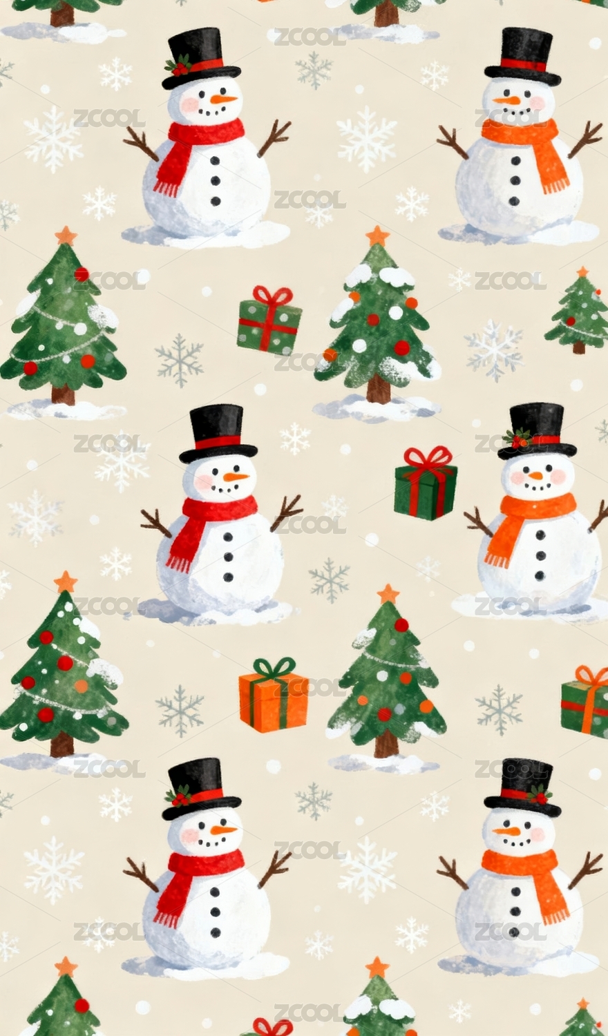 四方连续手绘圣诞雪人圣诞树雪花绿色背景