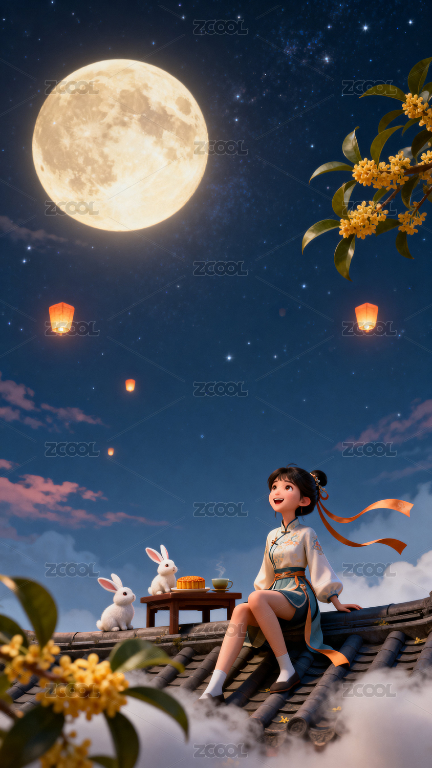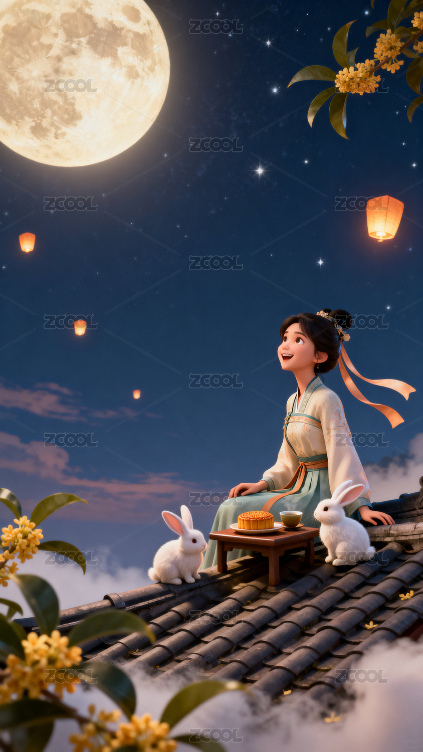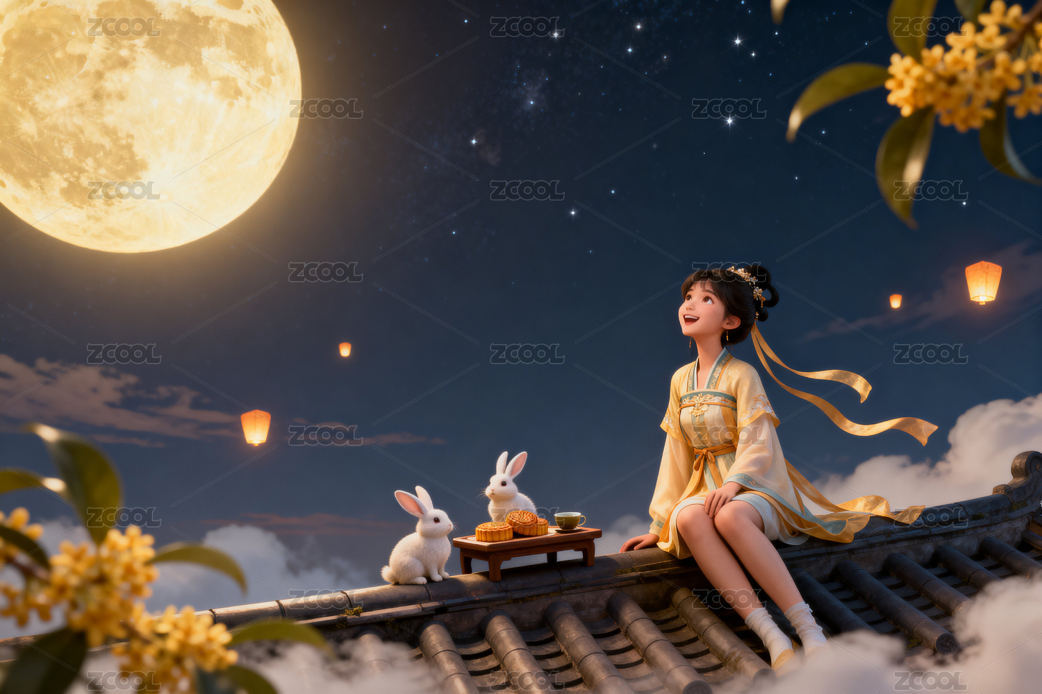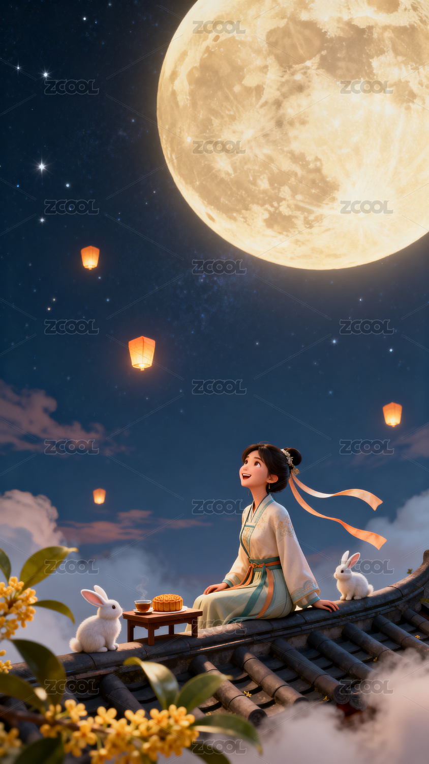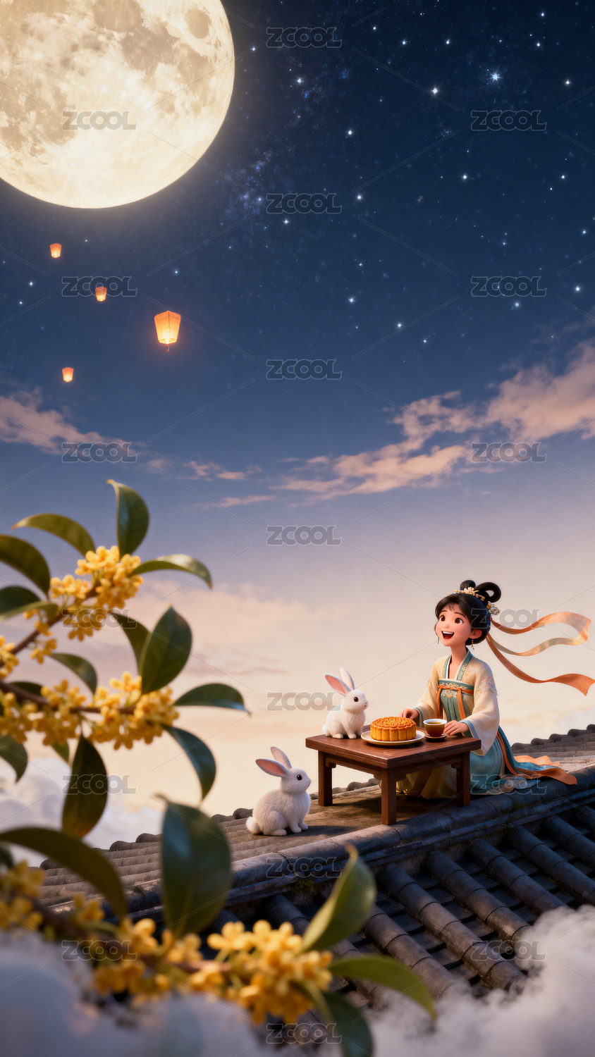 嫦娥,玉兔,屋檐,月饼,圆月,孔明灯,桂花,云朵,夜空,星星