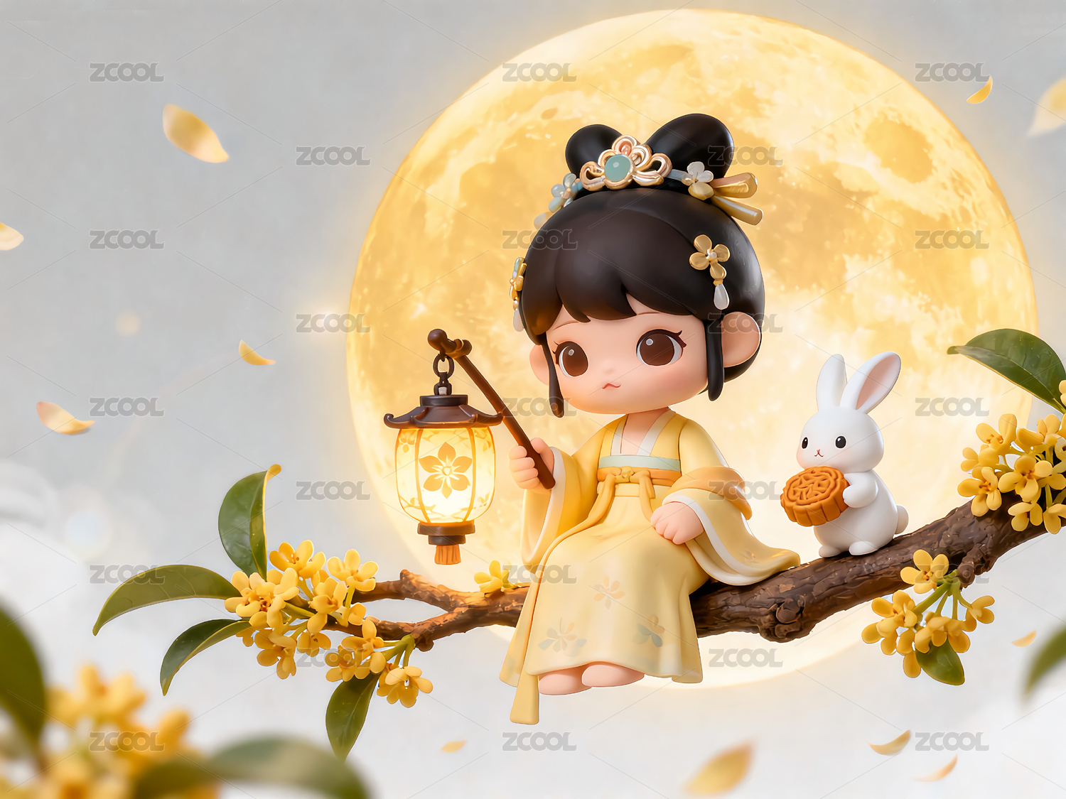 嫦娥和玉兔坐在屋顶在桂花树下赏月
