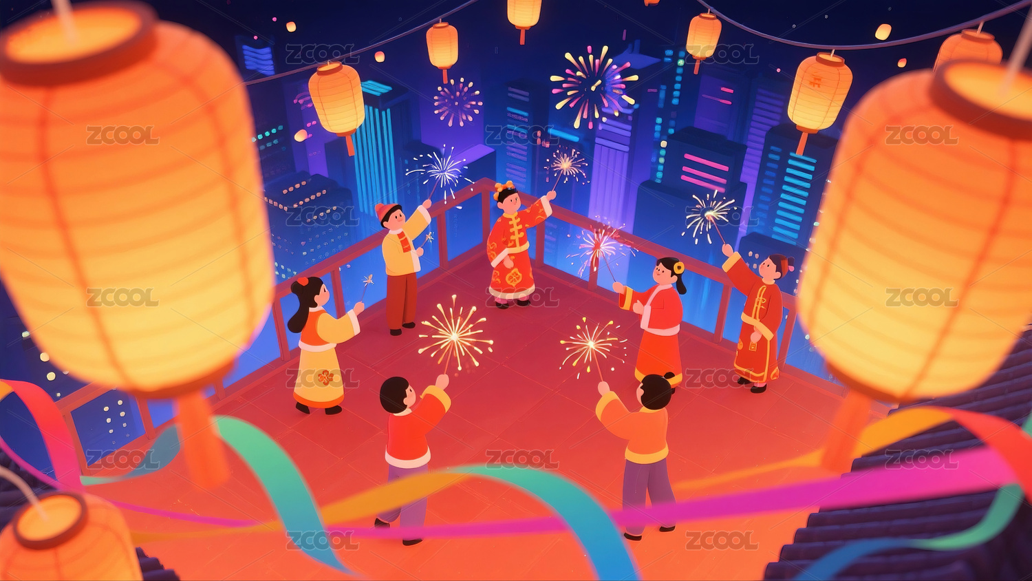 中国风建筑灯笼烟花喜庆插画