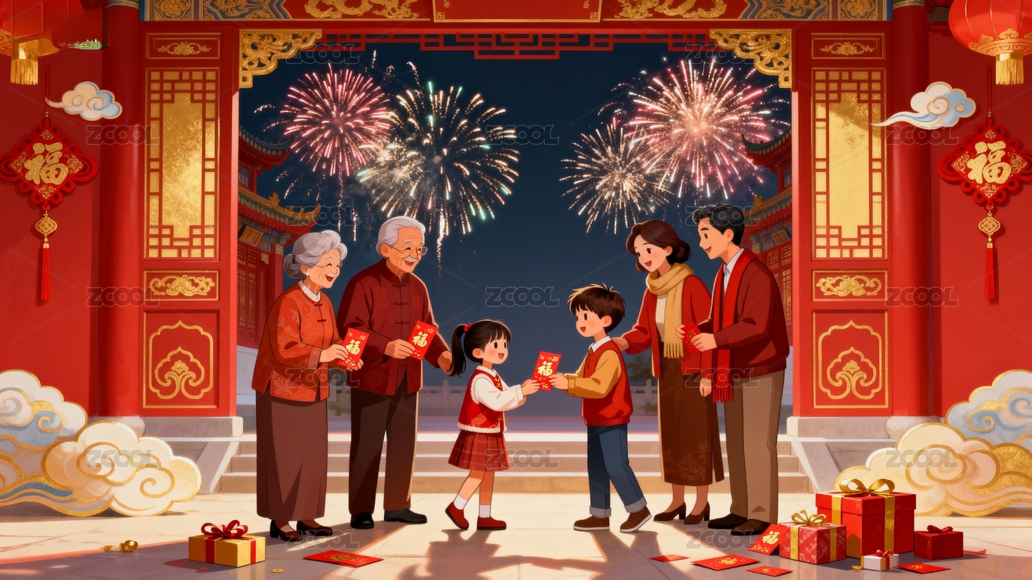 新年烟花儿童欢庆传统建筑