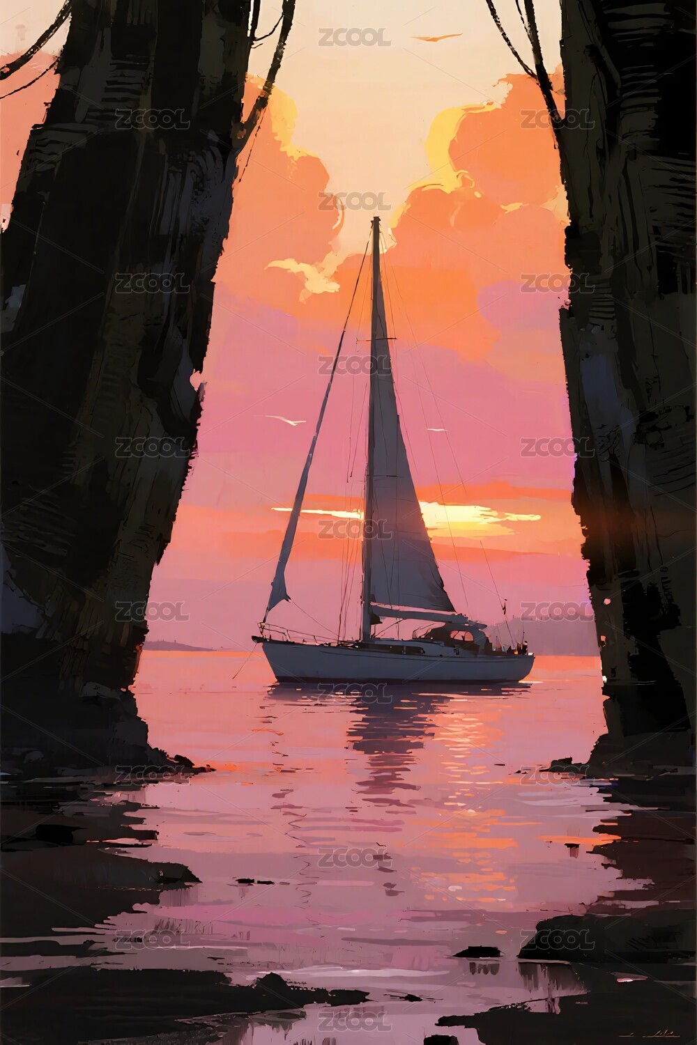 落日帆船航行海面艺术插画