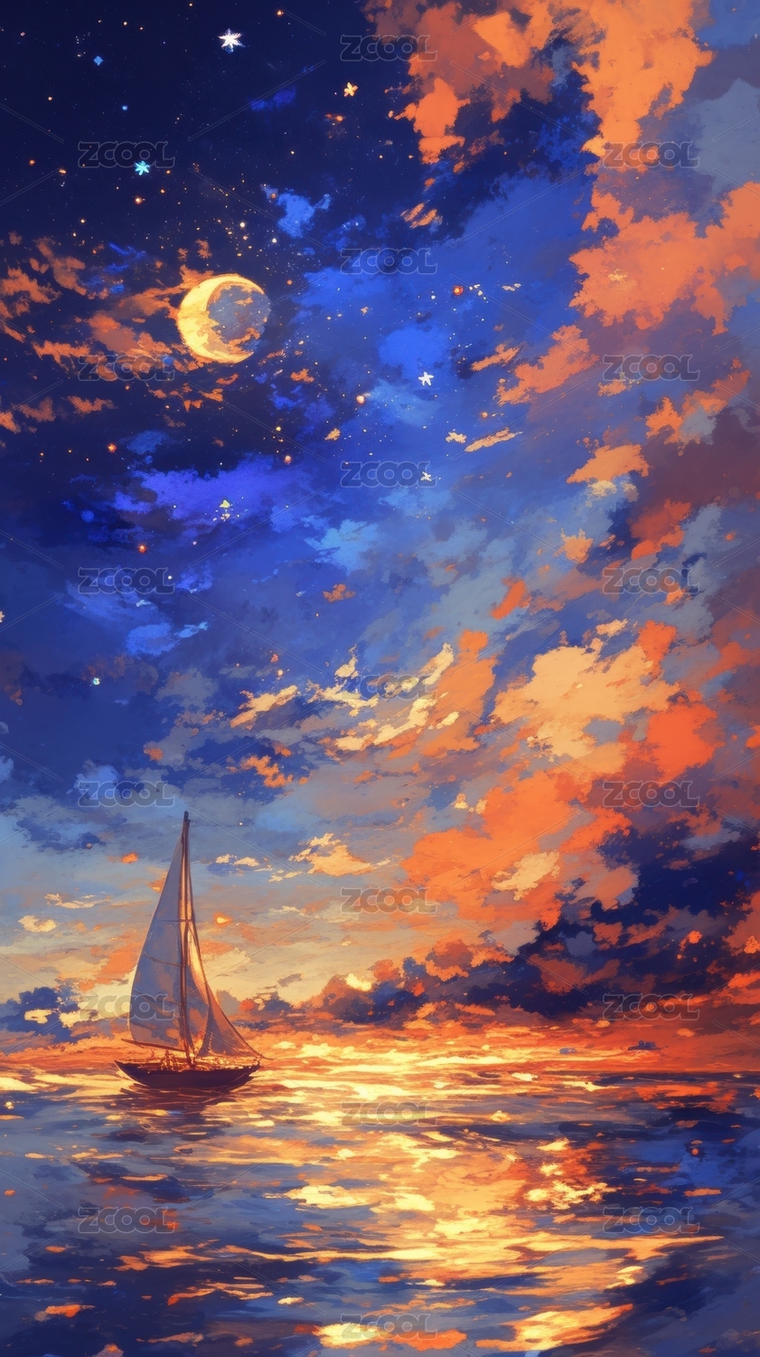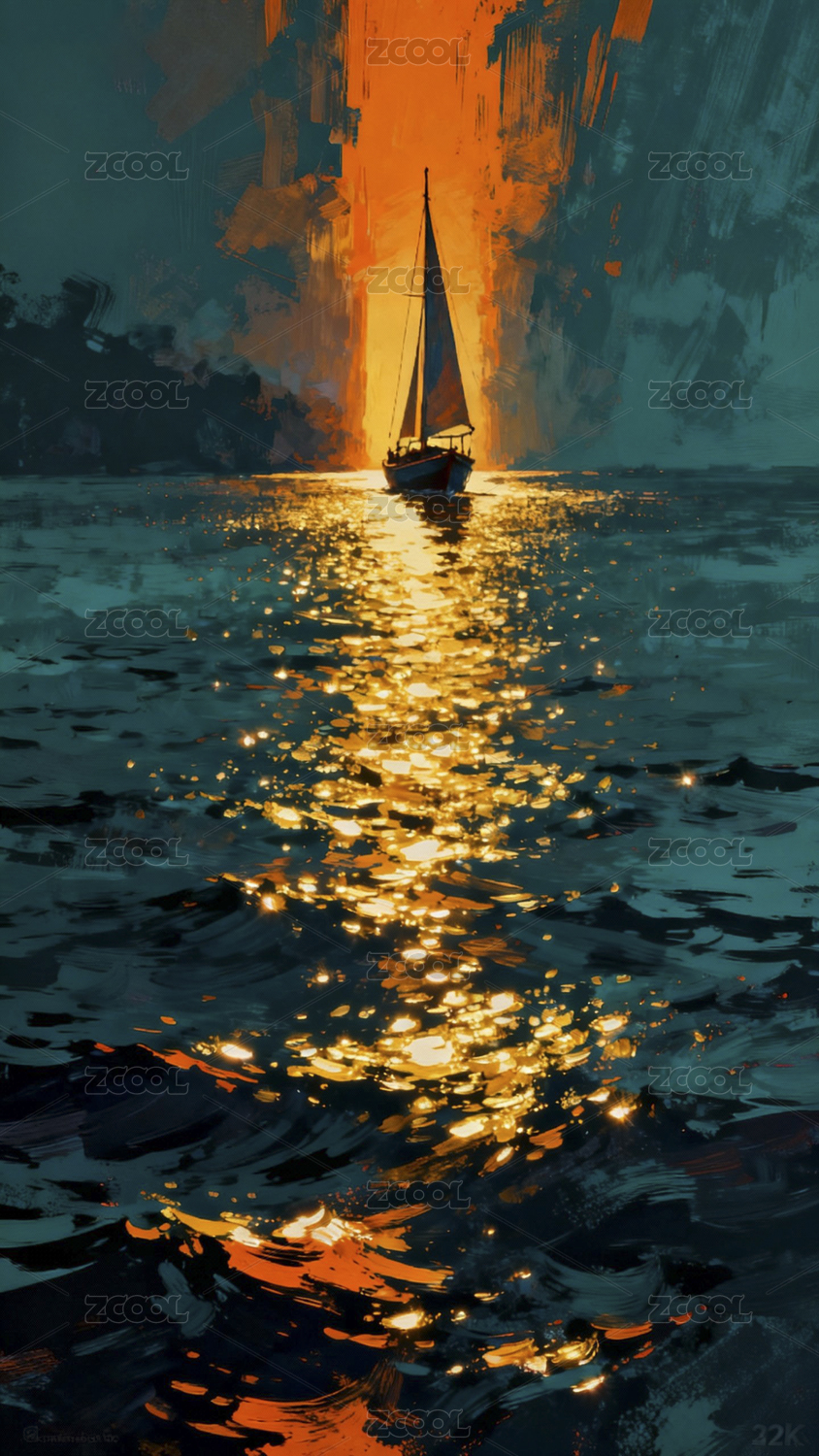 帆船,落日,晚霞,海面,油画,星空,倒影,海洋,夜晚,意境