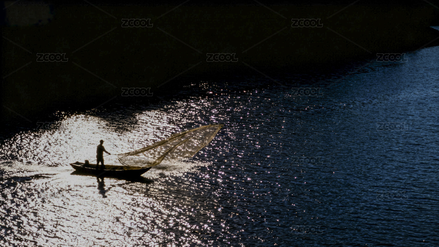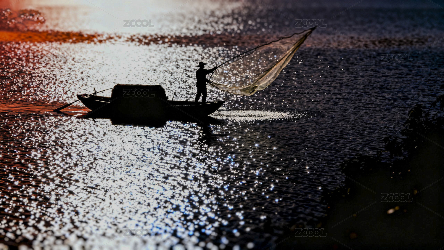 渔民,撒网,夕阳,湖面,波光粼粼,渔船,捕鱼,剪影,落日余晖,水面